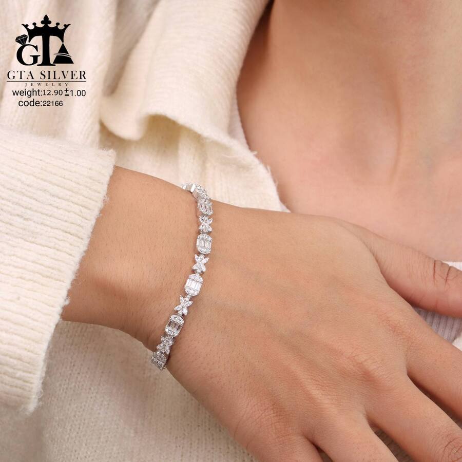 دستبند میکرو نقره همراه با روکش آبطلای سفید؛ عیار 925، تمامی نگین های این دستبند جدید و ظریف با روش جدید میکروستینگ مخراج کاری شده است.