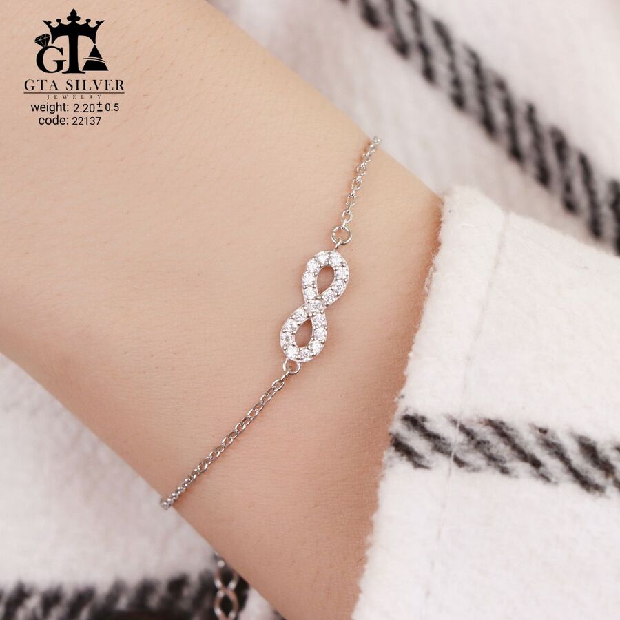 دستبند میکرو نقره طرح بی نهایت همراه با روکش آبطلای سفید؛ عیار 925، تمامی نگین های این دستبند جدید و ظریف با روش جدید میکروستینگ مخراج کاری شده است.