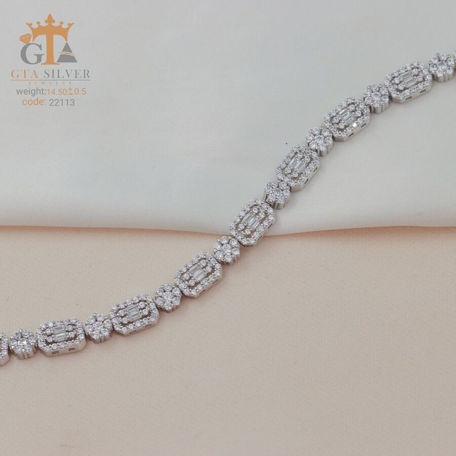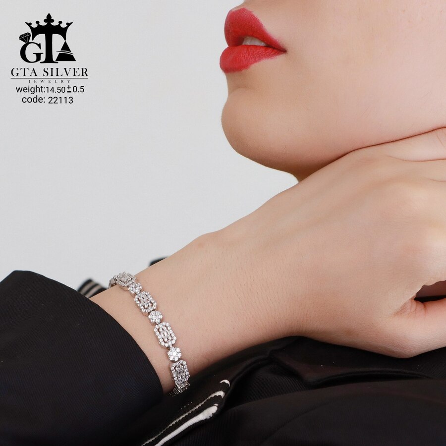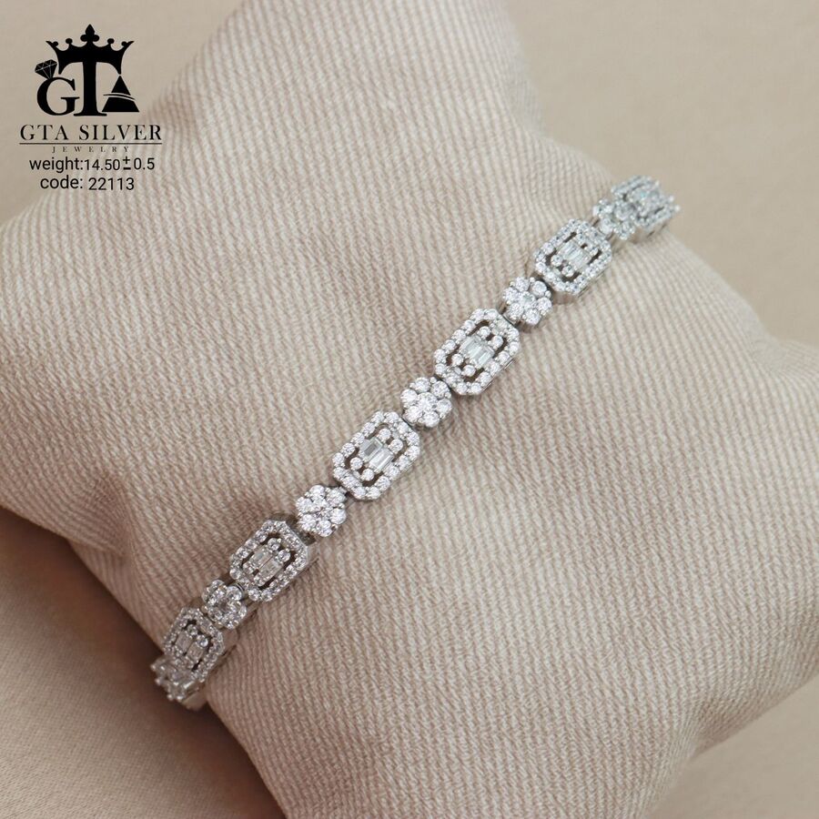 دستبند میکرو نقره همراه با روکش آبطلای سفید؛ عیار 925، تمامی نگین های این دستبند جدید و ظریف با روش جدید میکروستینگ مخراج کاری شده است.