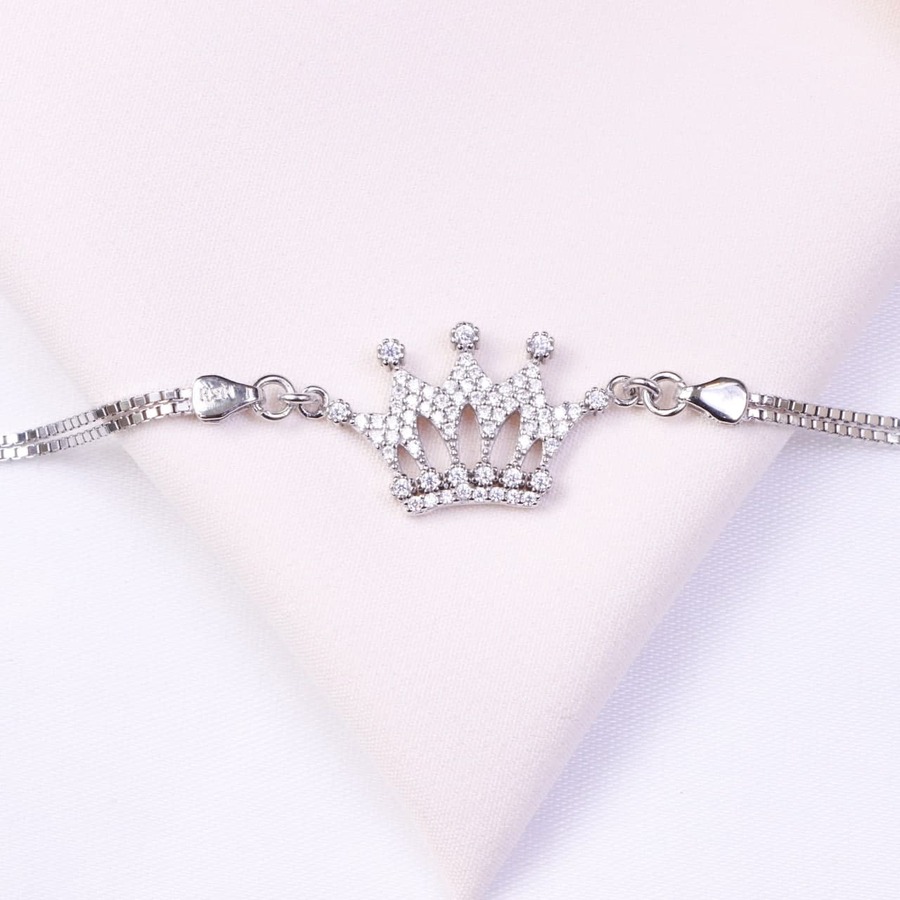 دستبند میکرو طرح تاج از نگین های برلیان و نقره عیار 925 ساخته شده است.
