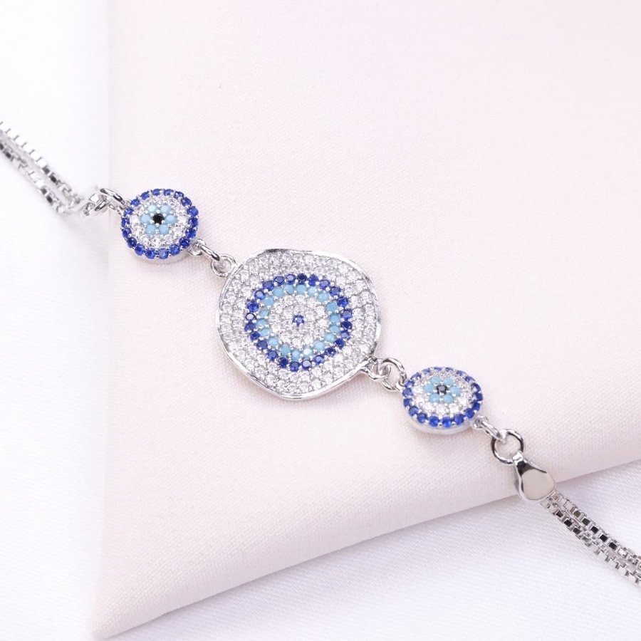 دستبند میکرو طرح چشم نظر از نگین های برلیان و نقره عیار 925 ساخته شده است.