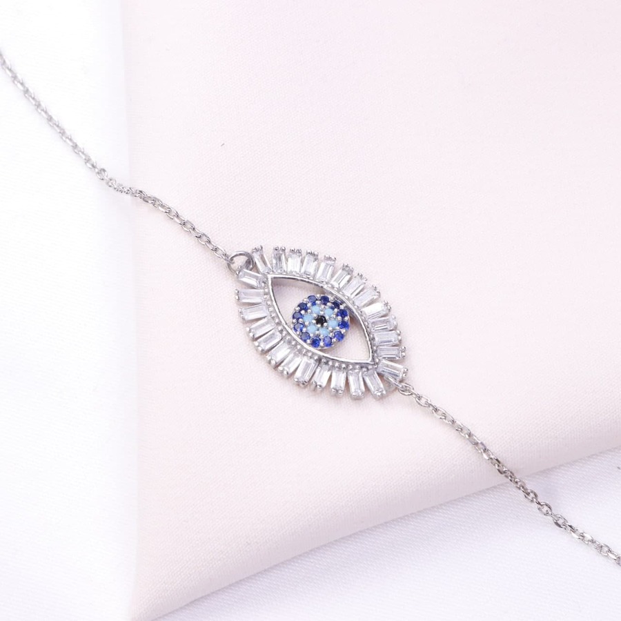 دستبند میکرو طرح چشم نظر از نگین های برلیان و نقره عیار 925 ساخته شده است.