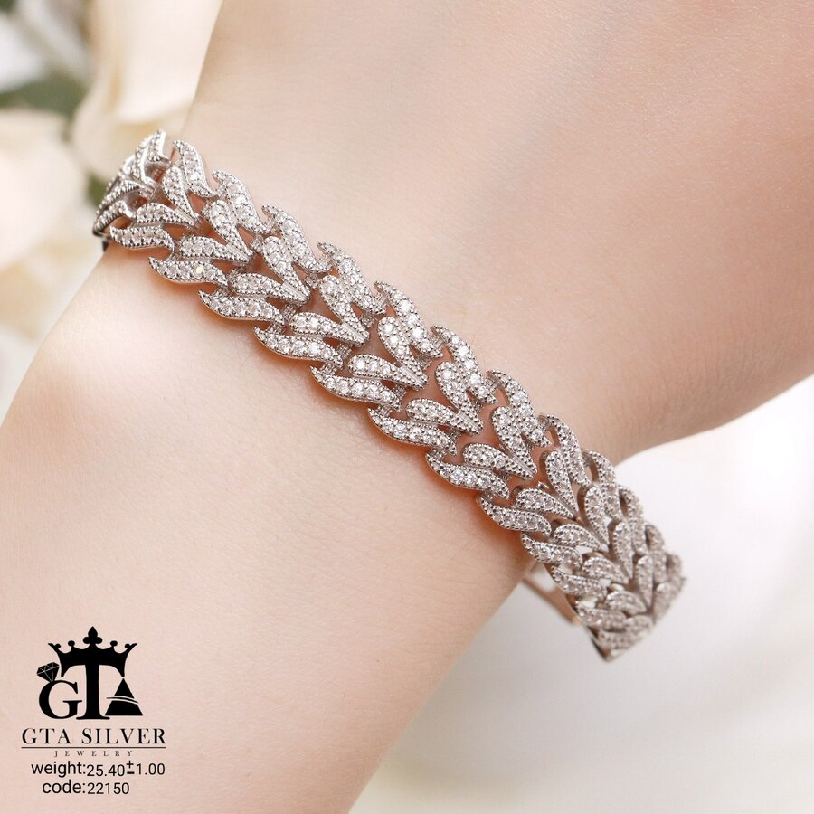 دستبند میکرو نقره همراه با روکش آبطلای سفید؛ عیار 925، تمامی نگین های این دستبند جدید و ظریف با روش جدید میکروستینگ مخراج کاری شده است.