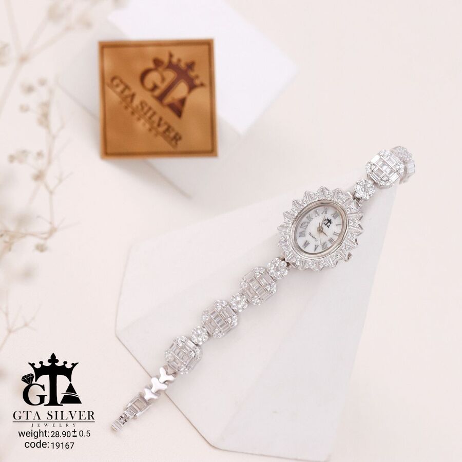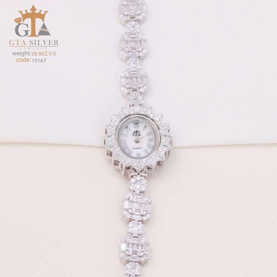 ساعت جواهری رودیوم با نگین های برلیان, کاری بسیار ظریف و زیبا همراه با روکش آب طلای سفید می باشد. عیار این کار همانند تمامی کار های موجود عیار استاندارد 925 می باشد.