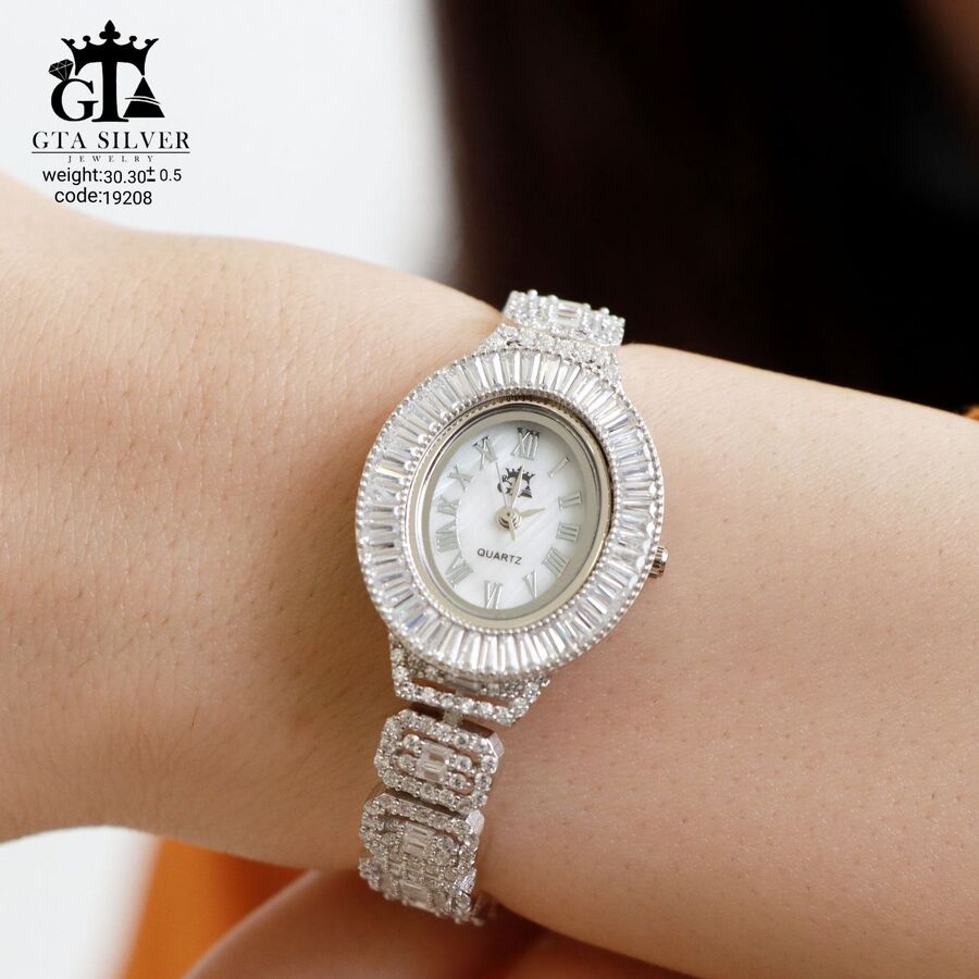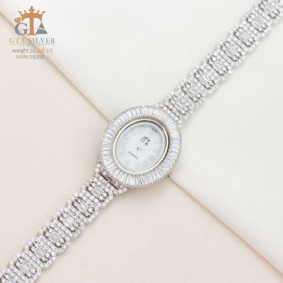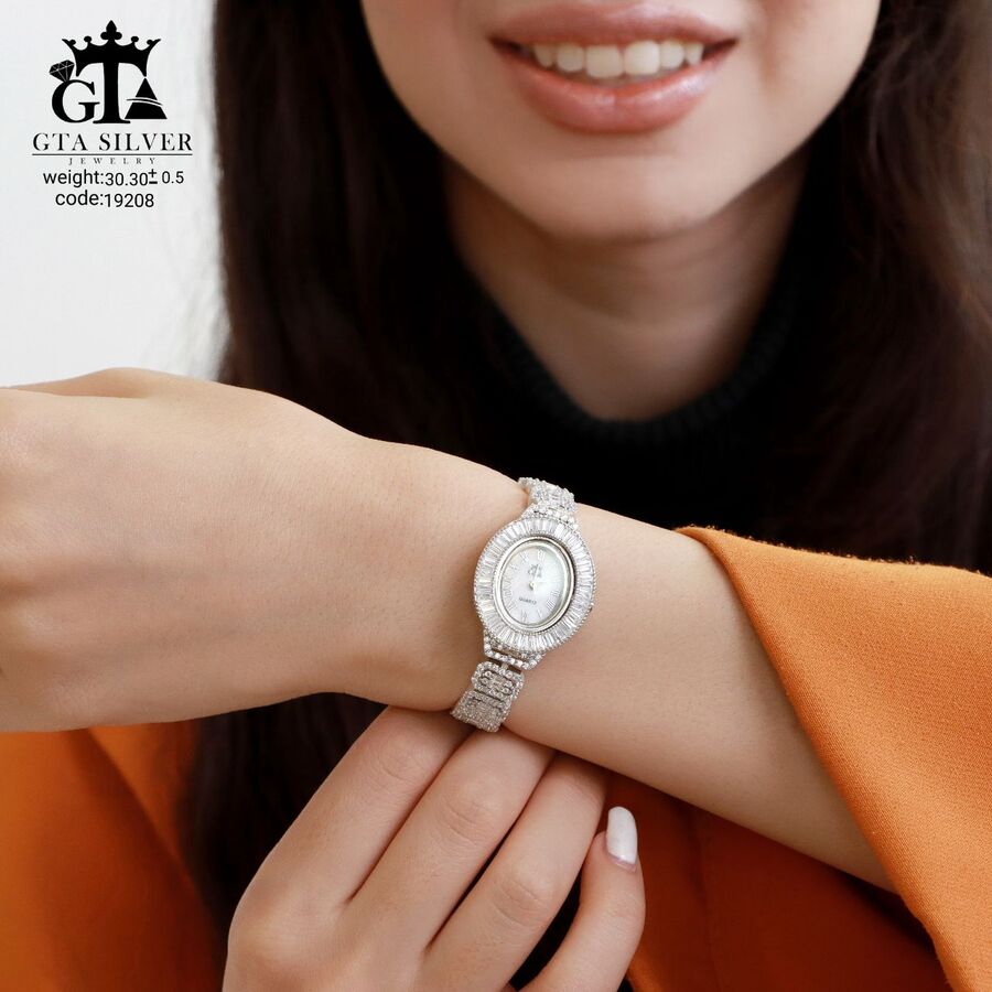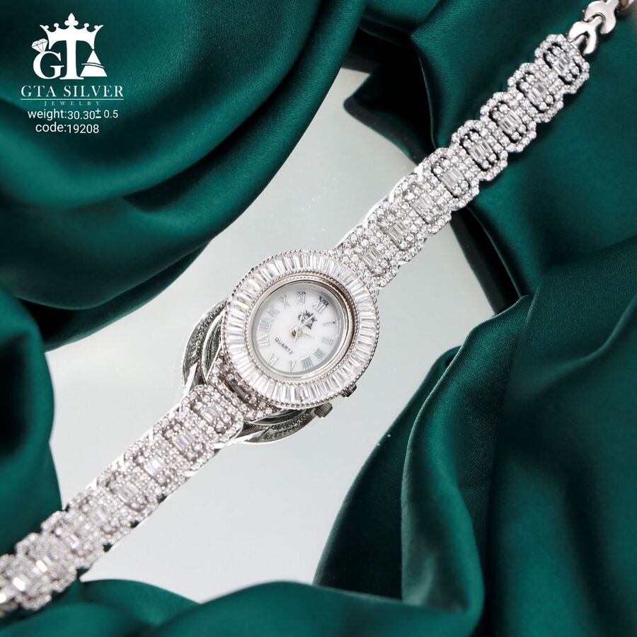 ساعت جواهری رودیوم مارک GTA طرح امرالدکات با نگین های برلیان, باگت و تیپرز, کاری بسیار ظریف و زیبا همراه با روکش آب طلای سفید می باشد. عیار این کار همانند تمامی کار های موجود عیار استاندارد 925 می باشد.