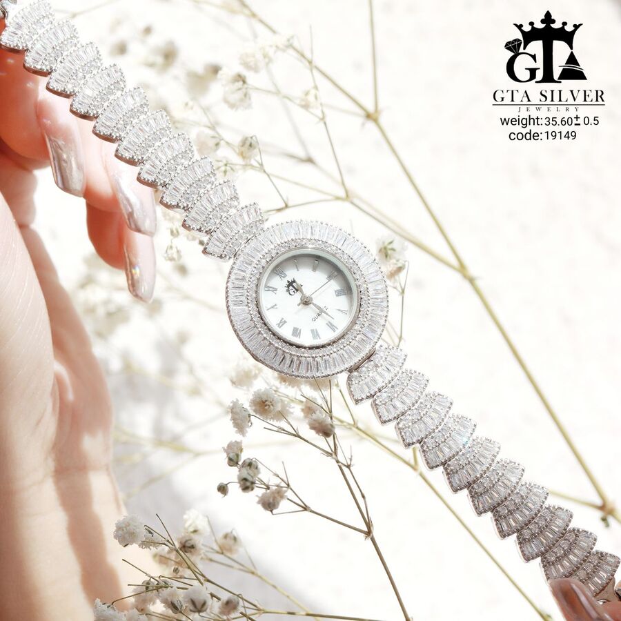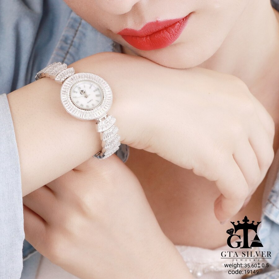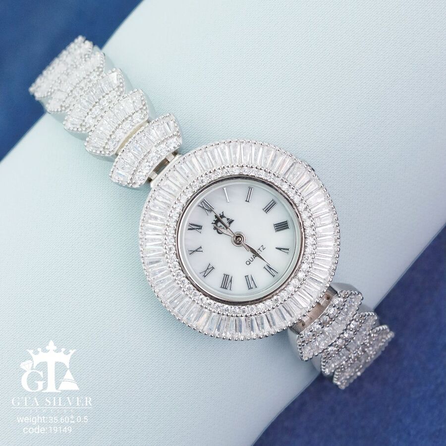 ساعت جواهری رودیوم با نگین های برلیان, کاری بسیار ظریف و زیبا همراه با روکش آب طلای سفید می باشد. عیار این کار همانند تمامی کار های موجود عیار استاندارد 925 می باشد.