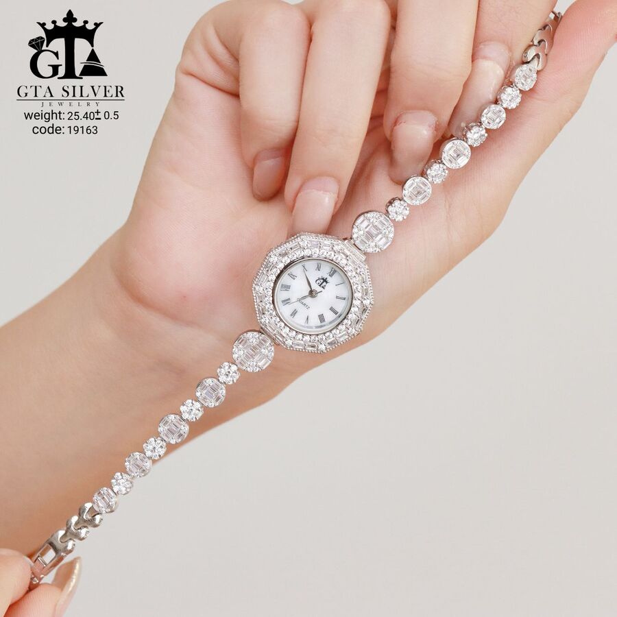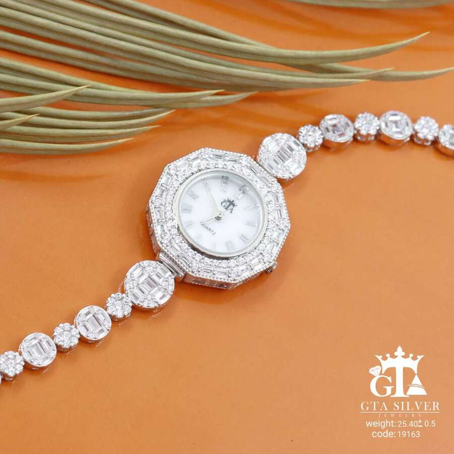 ساعت جواهری رودیوم مارک GTA با نگین های برلیان و باگت, کاری بسیار ظریف و زیبا همراه با روکش آب طلای سفید می باشد. عیار این کار همانند تمامی کار های موجود عیار استاندارد 925 می باشد.