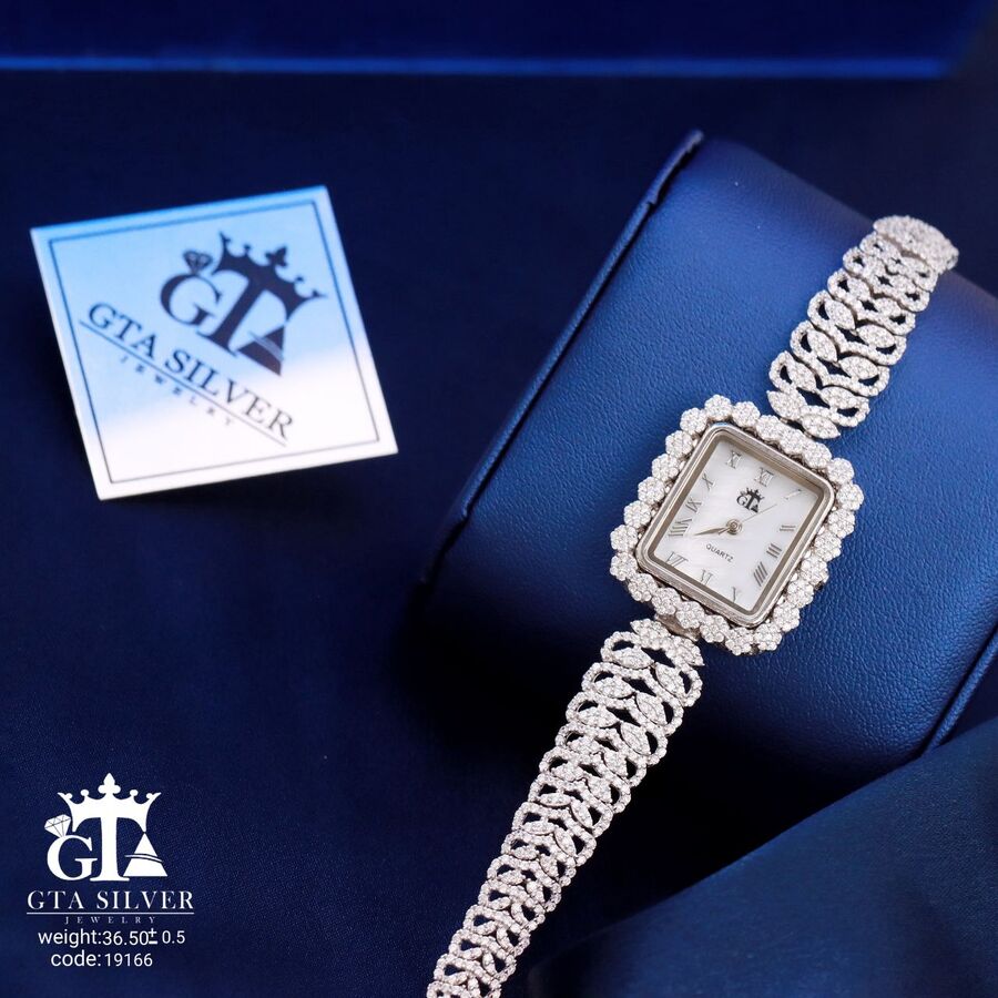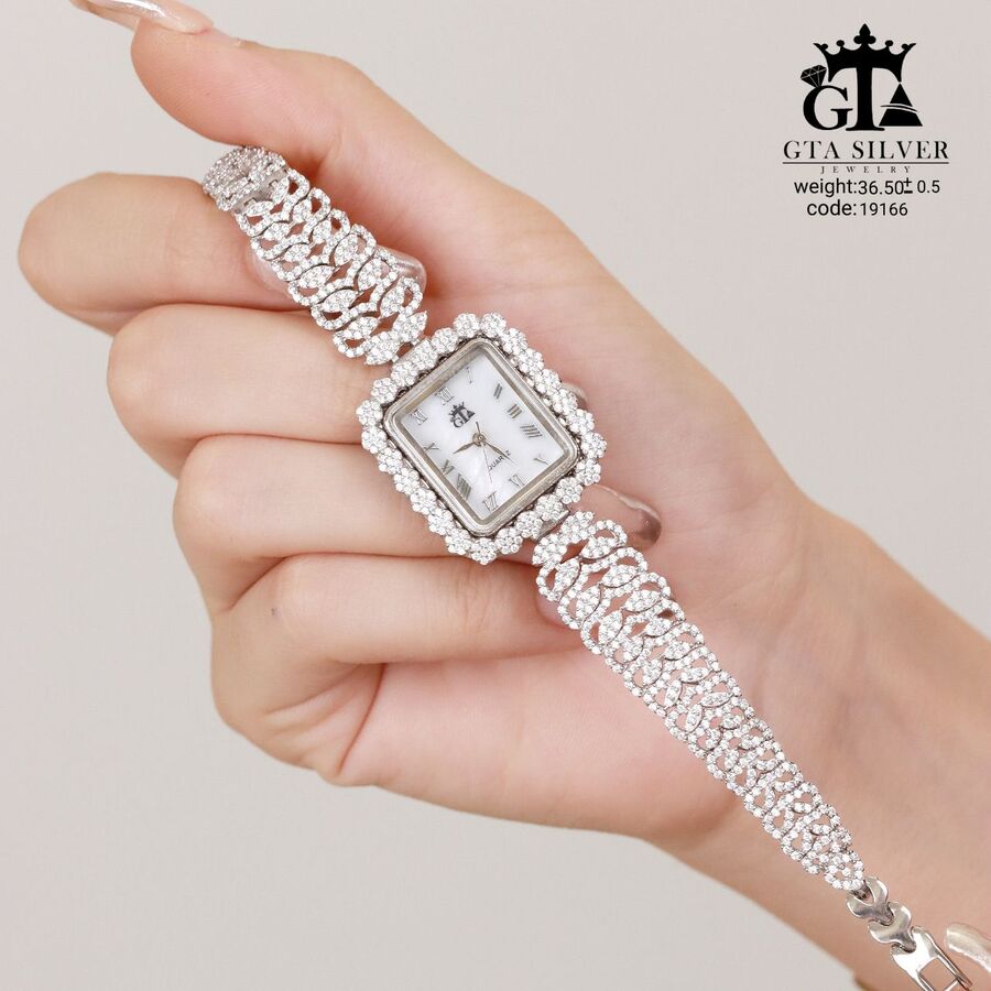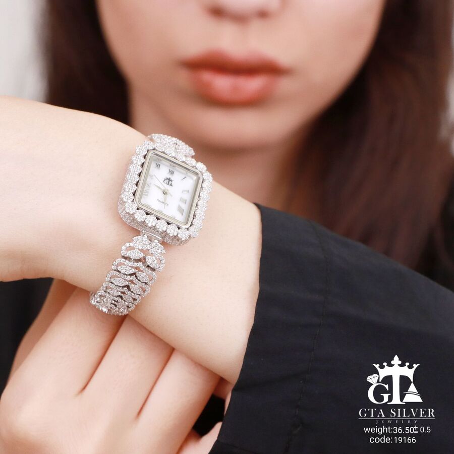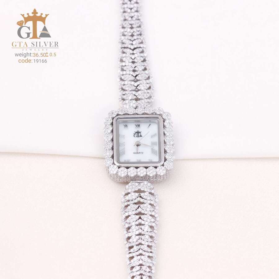 ساعت جواهری رودیوم با نگین های برلیان, کاری بسیار ظریف و زیبا همراه با روکش آب طلای سفید می باشد. عیار این کار همانند تمامی کار های موجود عیار استاندارد 925 می باشد.