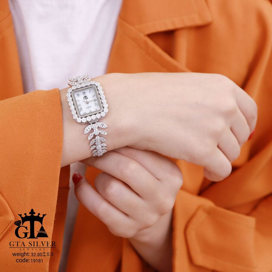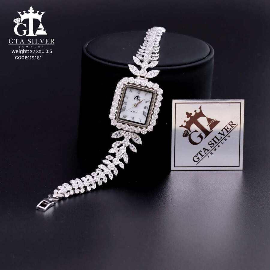 ساعت جواهری رودیوم با نگین های برلیان, کاری بسیار ظریف و زیبا همراه با روکش آب طلای سفید می باشد. عیار این کار همانند تمامی کار های موجود عیار استاندارد 925 می باشد.