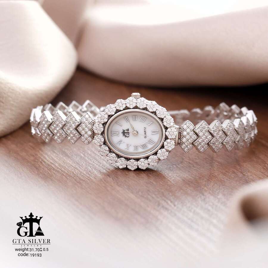 ساعت جواهری رودیوم با نگین های برلیان, کاری بسیار ظریف و زیبا همراه با روکش آب طلای سفید می باشد. عیار این کار همانند تمامی کار های موجود عیار استاندارد 925 می باشد.