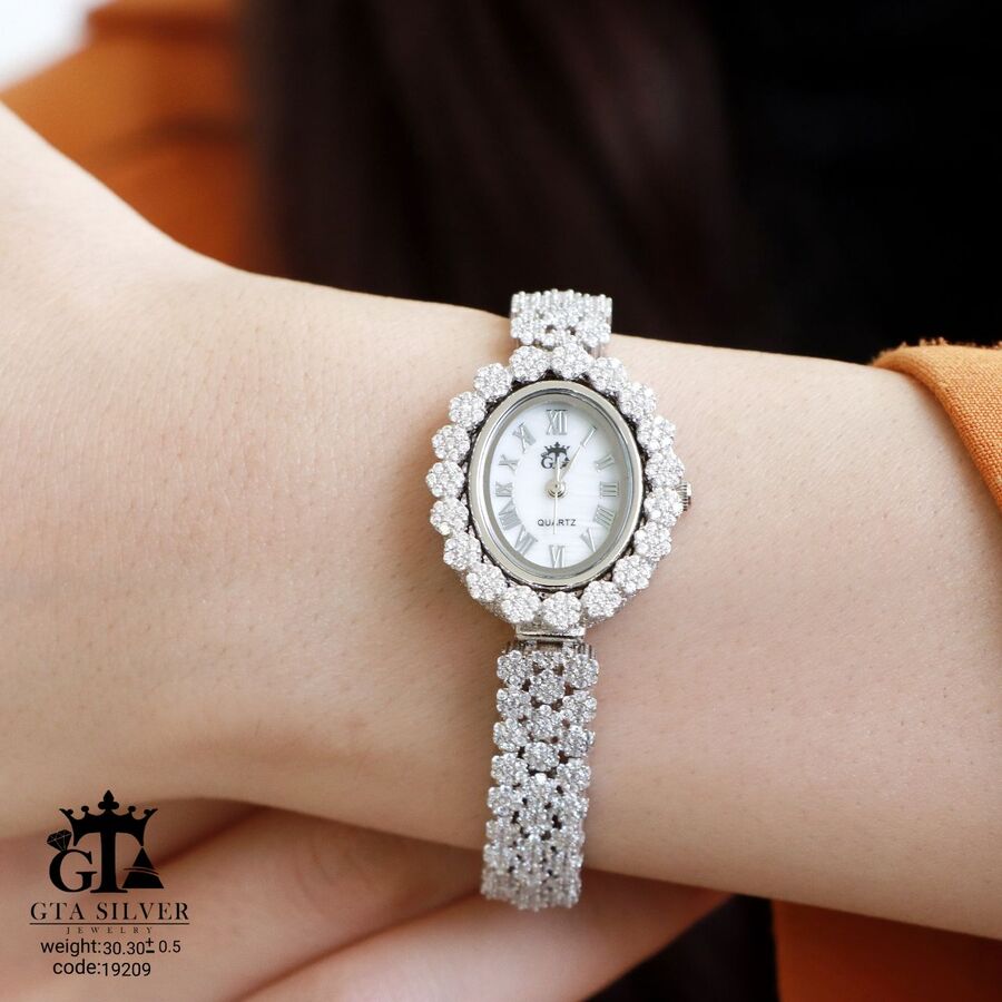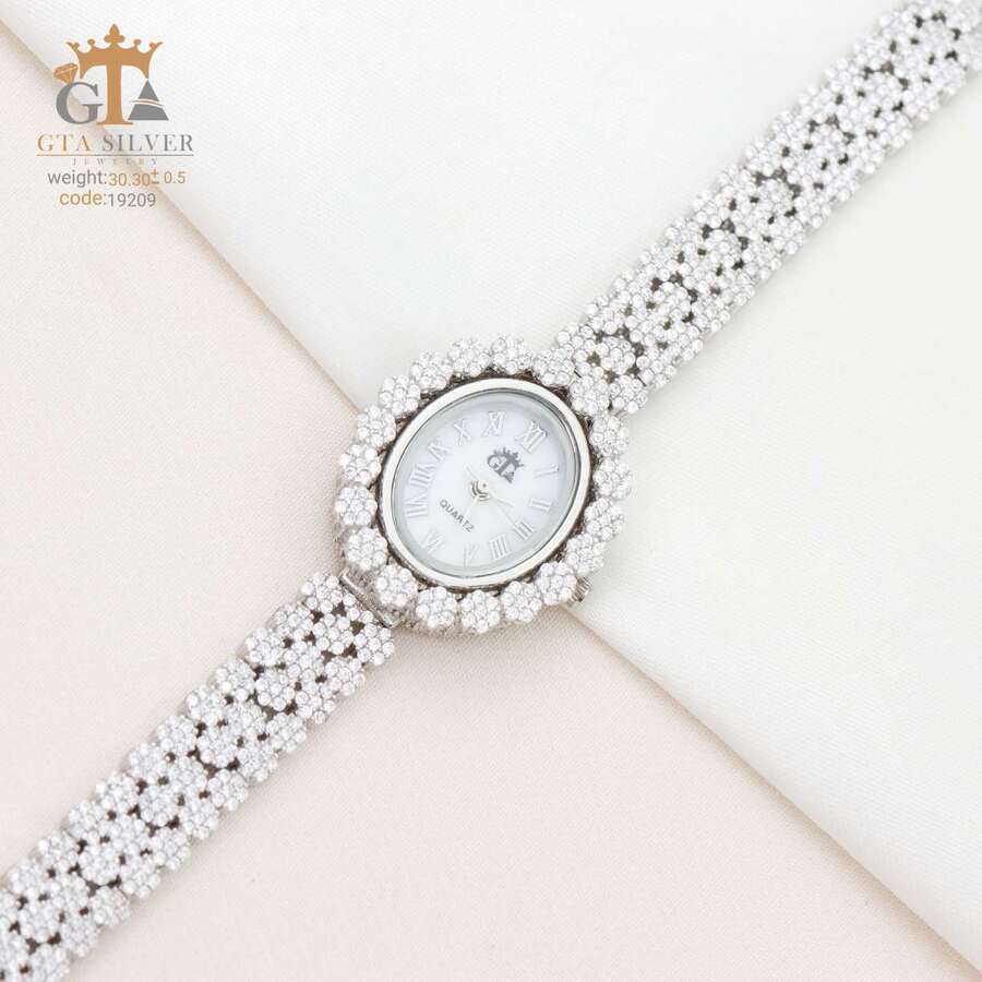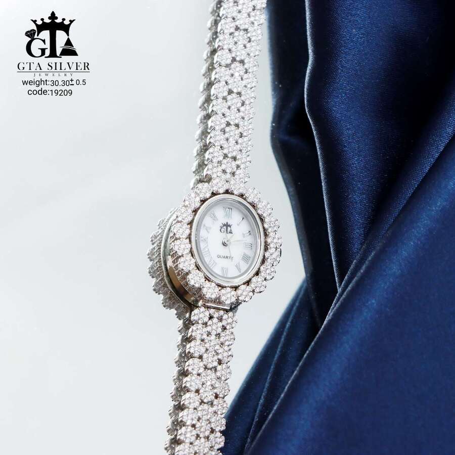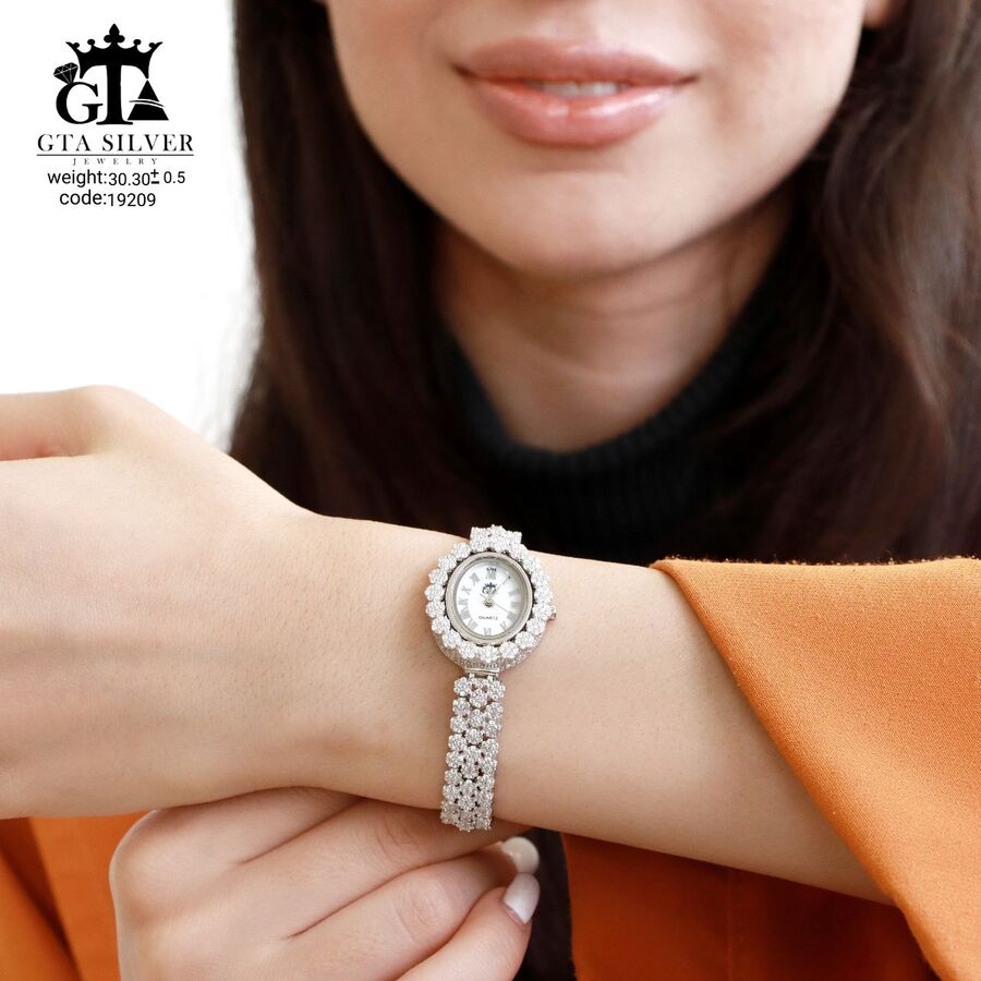 ساعت جواهری رودیوم با نگین های برلیان, کاری بسیار ظریف و زیبا همراه با روکش آب طلای سفید می باشد. عیار این کار همانند تمامی کار های موجود عیار استاندارد 925 می باشد.
