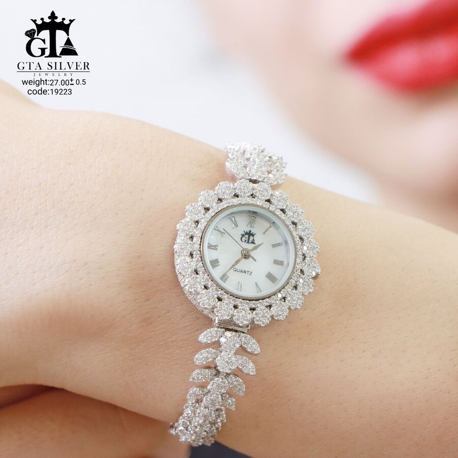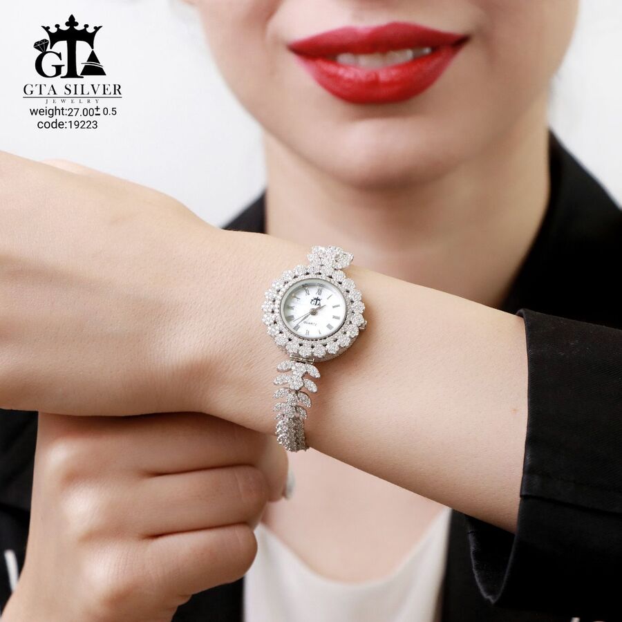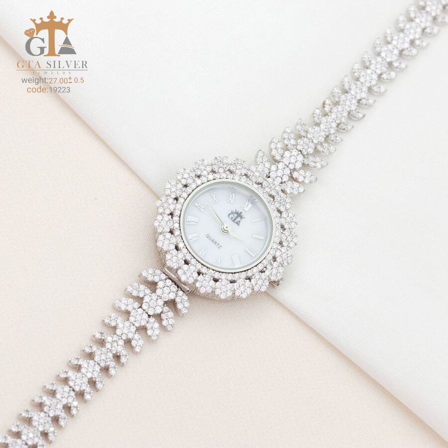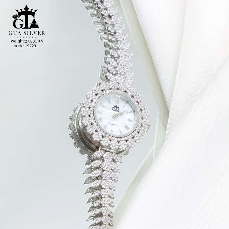 ساعت جواهری رودیوم با نگین های برلیان, کاری بسیار ظریف و زیبا همراه با روکش آب طلای سفید می باشد. عیار این کار همانند تمامی کار های موجود عیار استاندارد 925 می باشد.