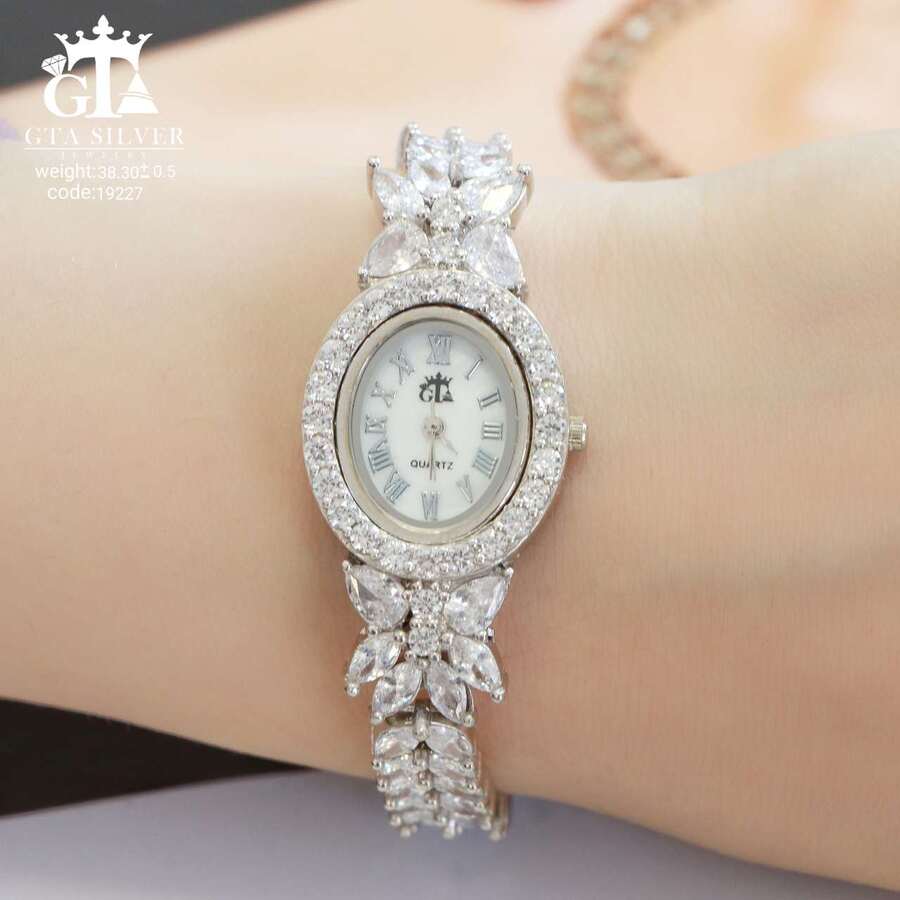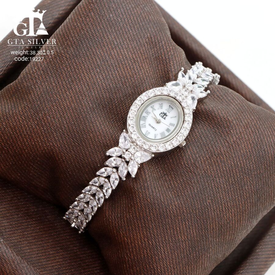 ساعت جواهری رودیوم با نگین های برلیان, مارکیز و اشک, کاری بسیار ظریف و زیبا همراه با روکش آب طلای سفید می باشد. عیار این کار همانند تمامی کار های موجود عیار استاندارد 925 می باشد.