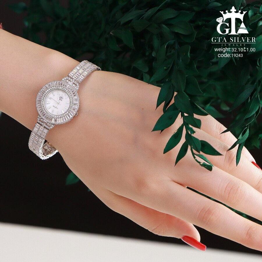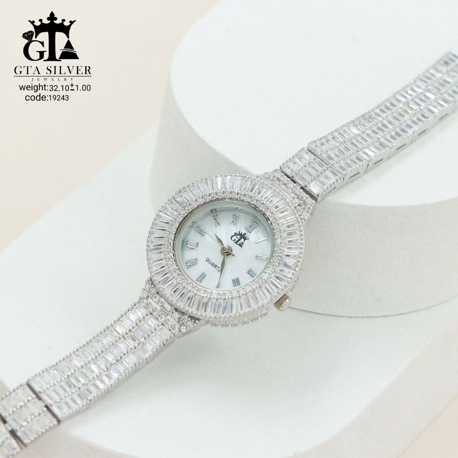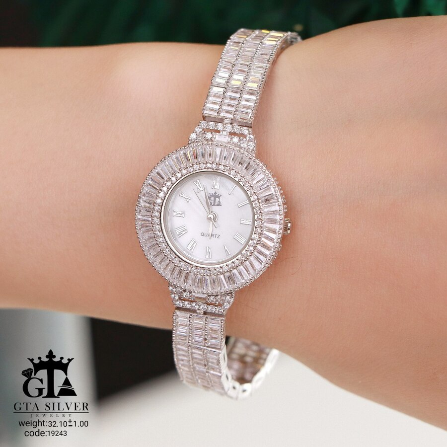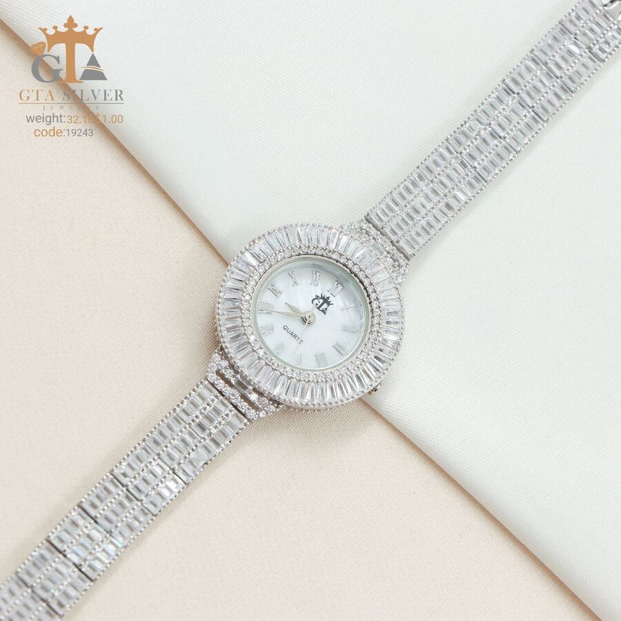 ساعت جواهری رودیوم با نگین های برلیان, باگت و تیپرز, کاری بسیار ظریف و زیبا همراه با روکش آب طلای سفید می باشد. عیار این کار همانند تمامی کار های موجود عیار استاندارد 925 می باشد.