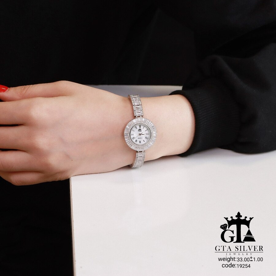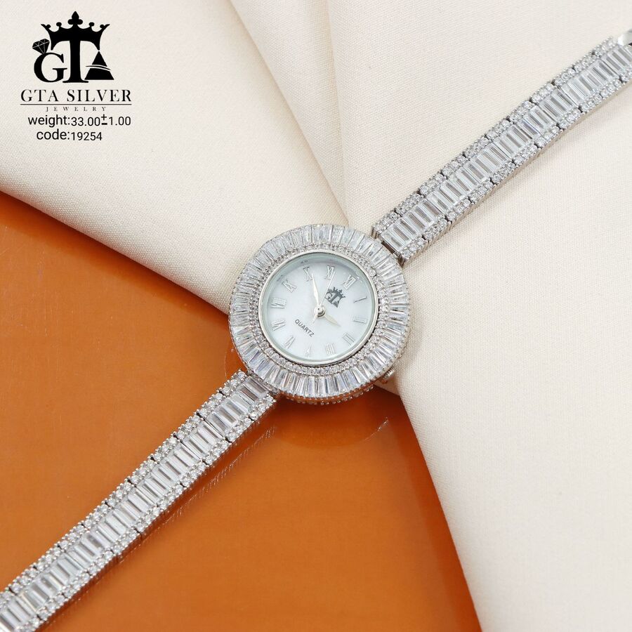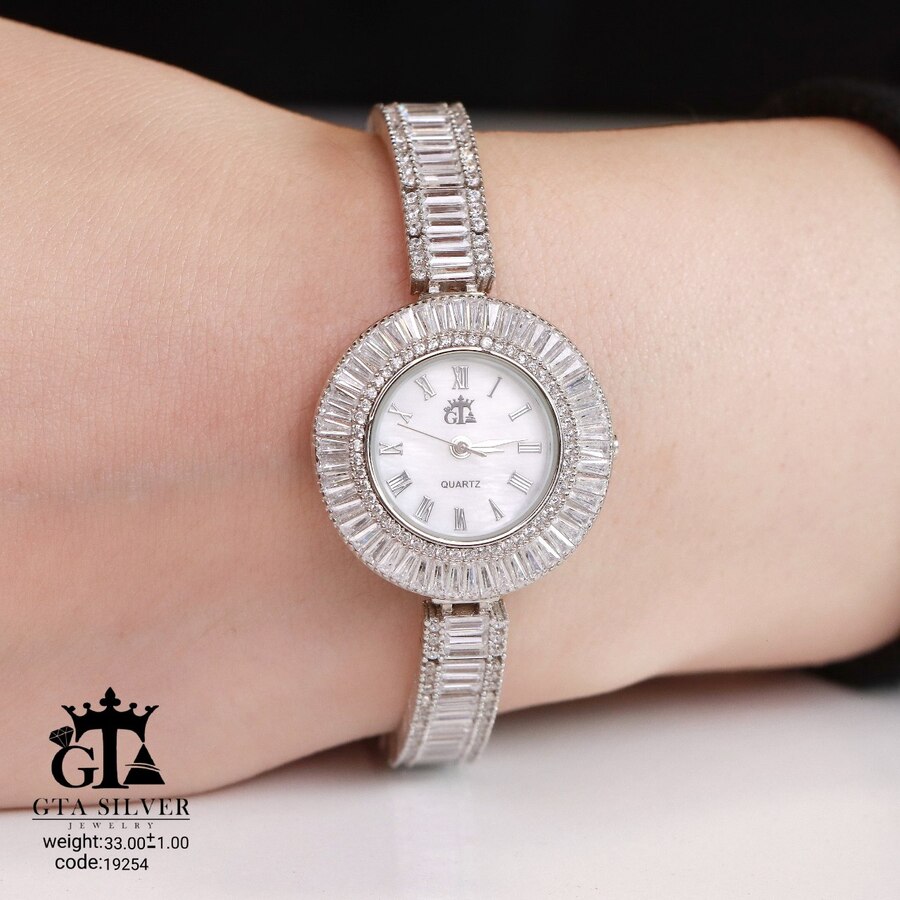 ساعت جواهری رودیوم با نگین های برلیان, باگت و تیپرز, کاری بسیار ظریف و زیبا همراه با روکش آب طلای سفید می باشد. عیار این کار همانند تمامی کار های موجود عیار استاندارد 925 می باشد.