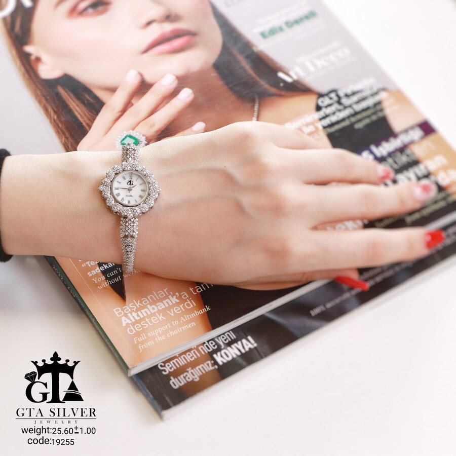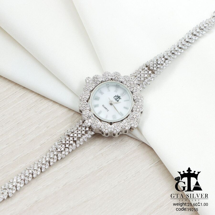 ساعت جواهری رودیوم با نگین های برلیان, کاری بسیار ظریف و زیبا همراه با روکش آب طلای سفید می باشد. عیار این کار همانند تمامی کار های موجود عیار استاندارد 925 می باشد.