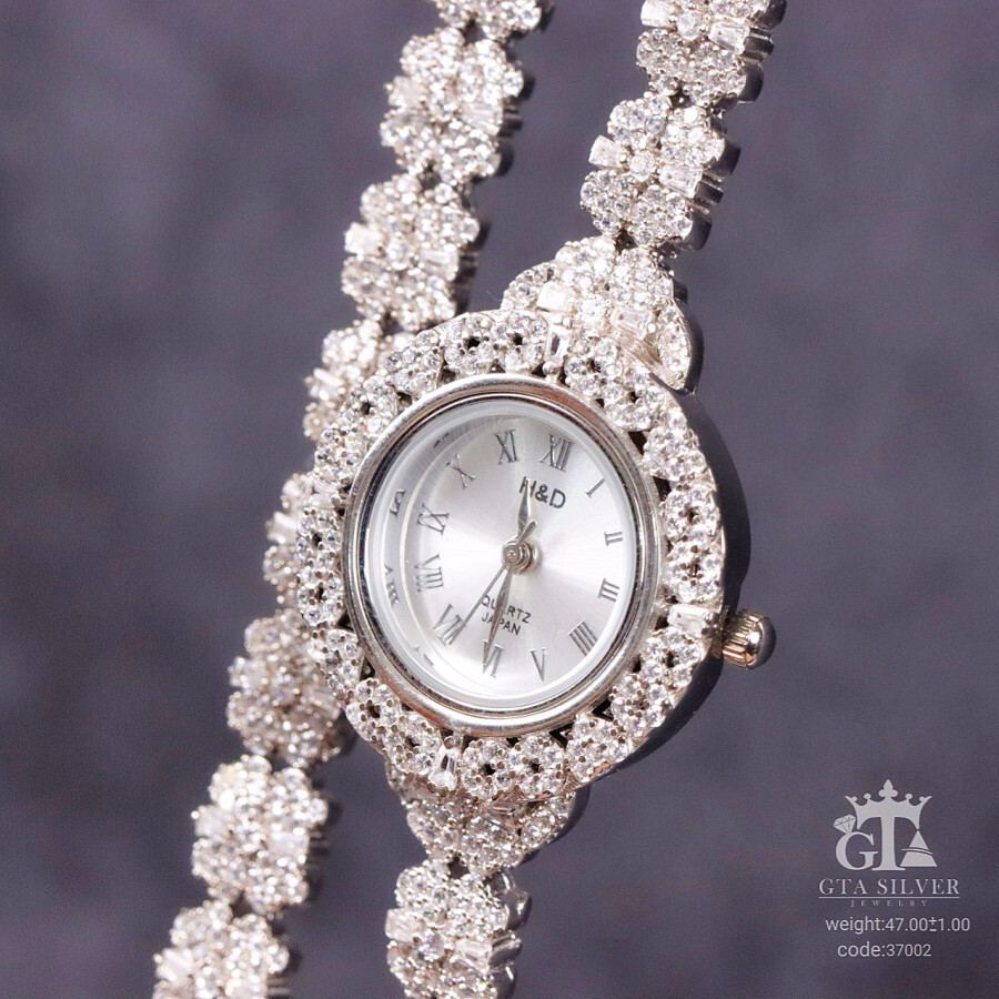 ست ساعت و دستبند نقره با روکش آبطلای سفید, نگین های برلیان و تیپرز این کار با روش به روز میکروستینگ مخراج کاری شده و به دلیل آبکاری رودیوم ضد حساسیت می باشد.