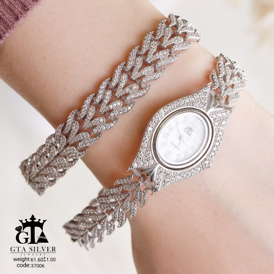 ست ساعت GTA و دستبند نقره با روکش آبطلای سفید, نگین های برلیان, این کار با روش به روز میکروستینگ مخراج کاری شده و به دلیل آبکاری رودیوم ضد حساسیت می باشد.