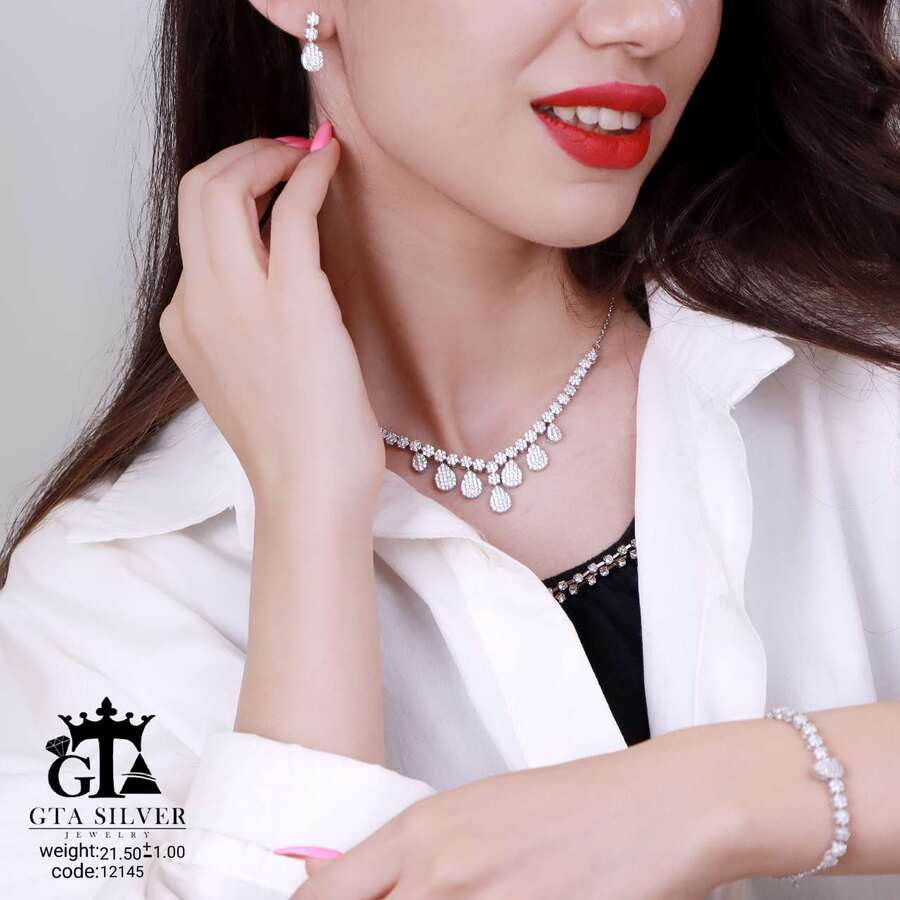 سرویس میکرو زنجیری نقره همراه با روکش آبطلای سفید؛ عیار 925، تمامی نگین های این سرویس جدید و ظریف با روش جدید میکروستینگ مخراج کاری شده است.