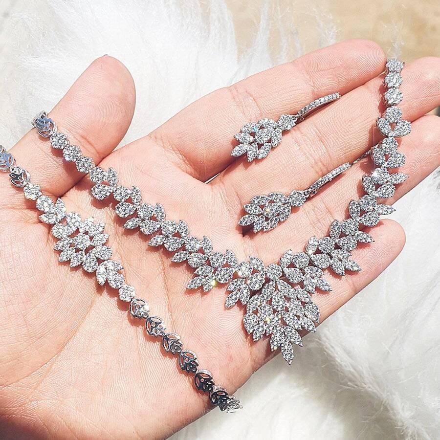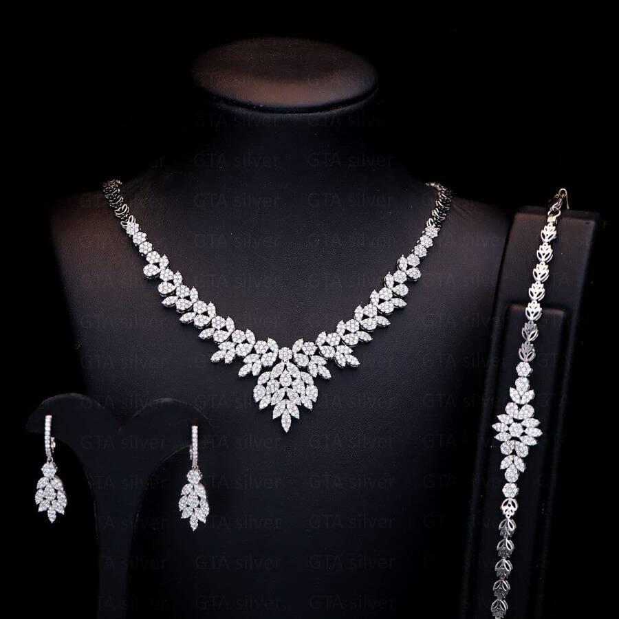 سرویس طرح آتنا که دارای روکش طلای سفید می باشد و نگین هایش با روش میکروستینگ مخراج کاری شده است. همچنین عیار این کار 925 می باشد.