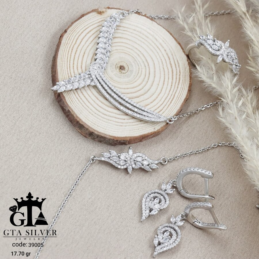 سرویس نقره مدل سوپر میکرو زنجیری همراه با روکش آبطلای سفید؛ عیار 925، تمامی نگین های این سرویس جدید با روش جدید میکروستینگ مخراج کاری شده است.