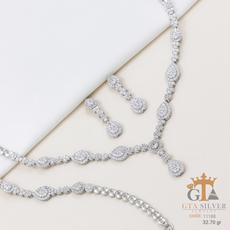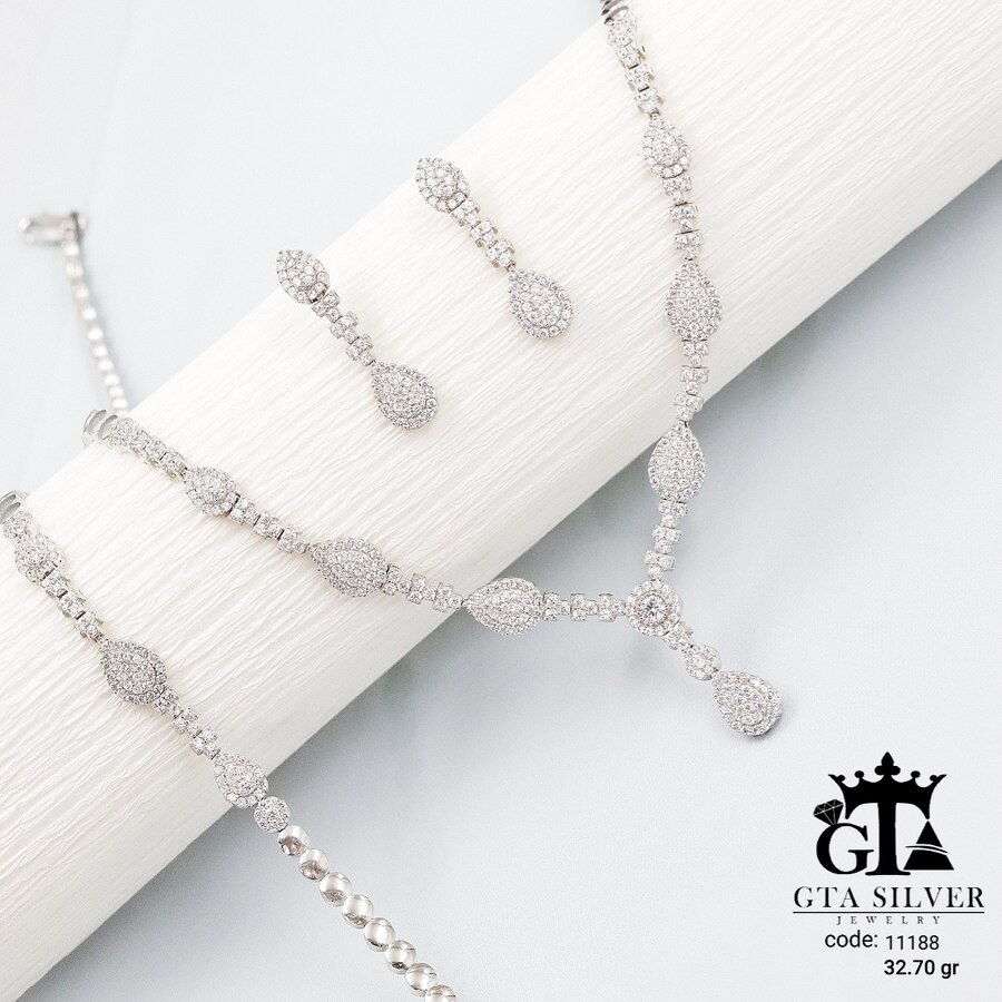 سرویس نقره مدل مارسا همراه با روکش آبطلای سفید؛ عیار 925، تمامی نگین های این سرویس جدید با روش جدید میکروستینگ مخراج کاری شده است.