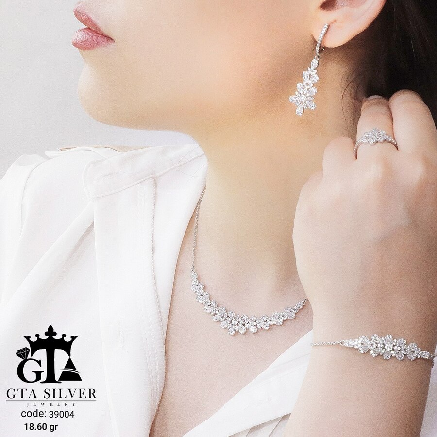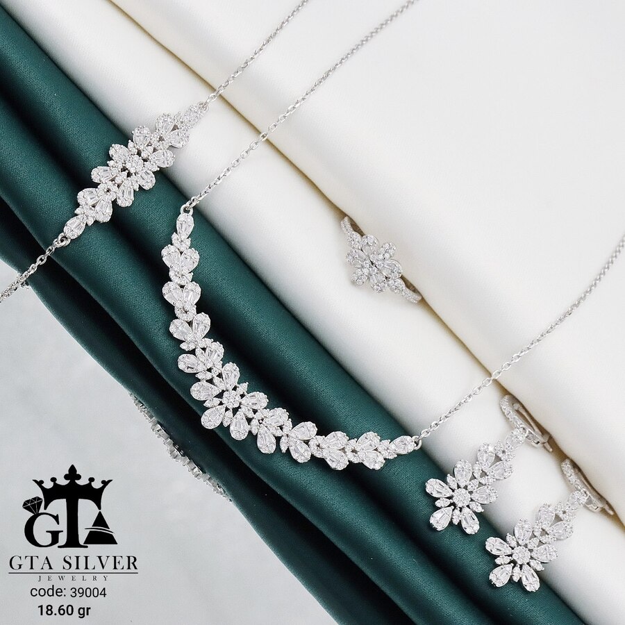 سرویس نقره مدل سوپر میکرو زنجیری همراه با روکش آبطلای سفید؛ عیار 925، تمامی نگین های این سرویس جدید با روش جدید میکروستینگ مخراج کاری شده است.