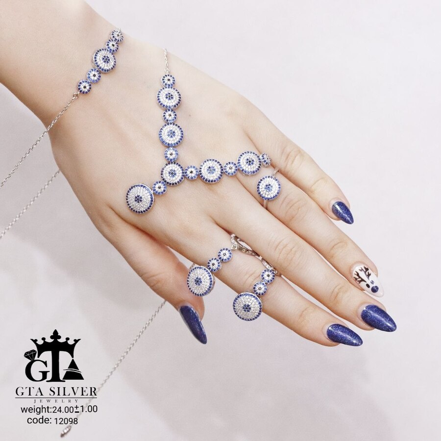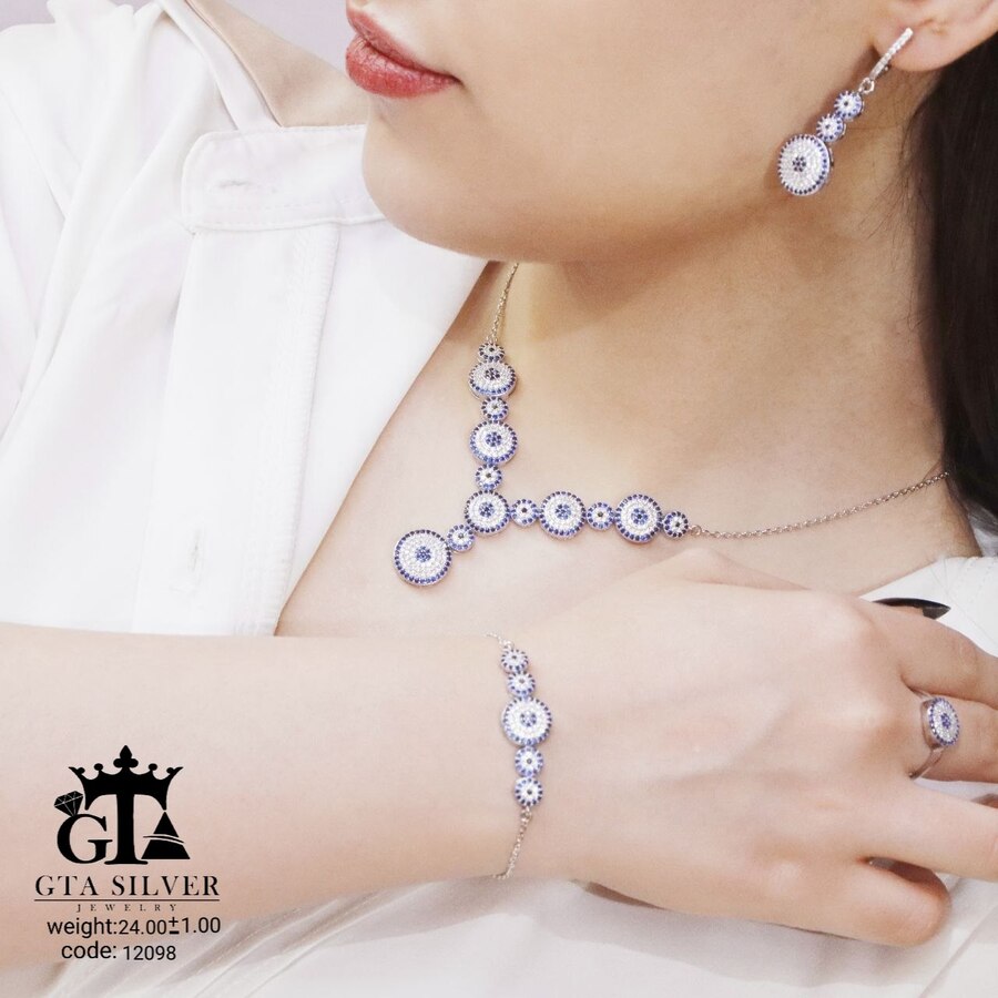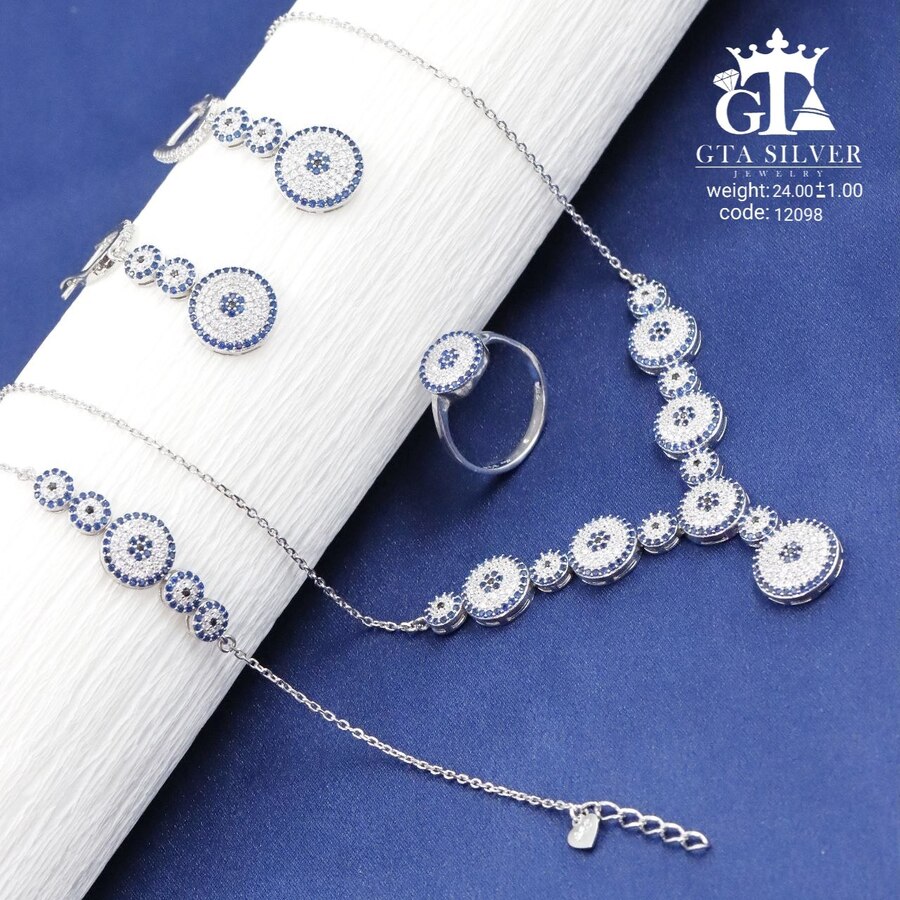 سرویس میکرو زنجیری طرح چشم نظر نقره همراه با روکش آبطلای سفید؛ عیار 925، تمامی نگین های این سرویس جدید و ظریف با روش جدید میکروستینگ مخراج کاری شده است.