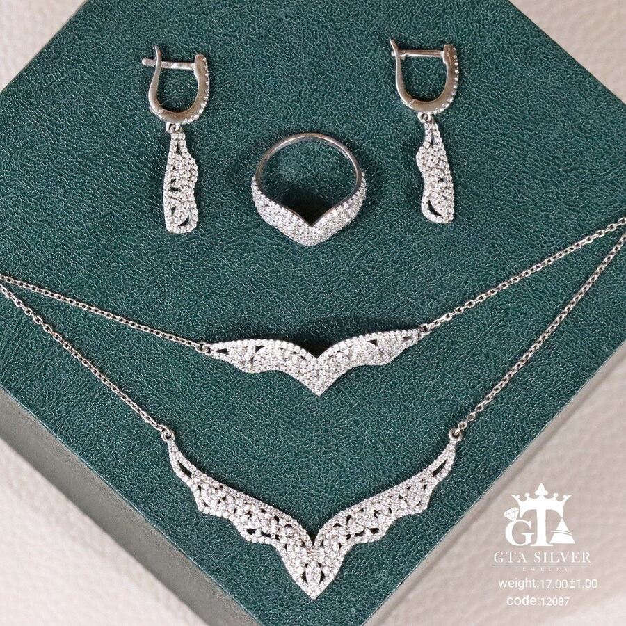 سرویس میکرو زنجیری نقره همراه با روکش آبطلای سفید؛ عیار 925، تمامی نگین های این سرویس جدید و ظریف با روش جدید میکروستینگ مخراج کاری شده است.