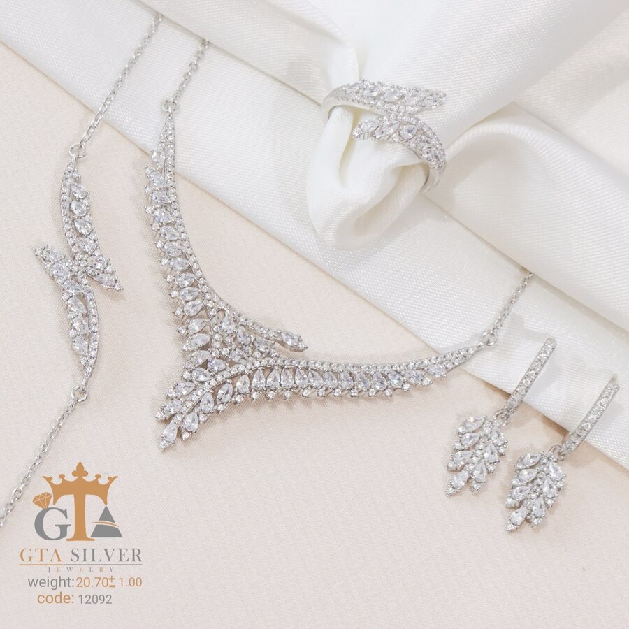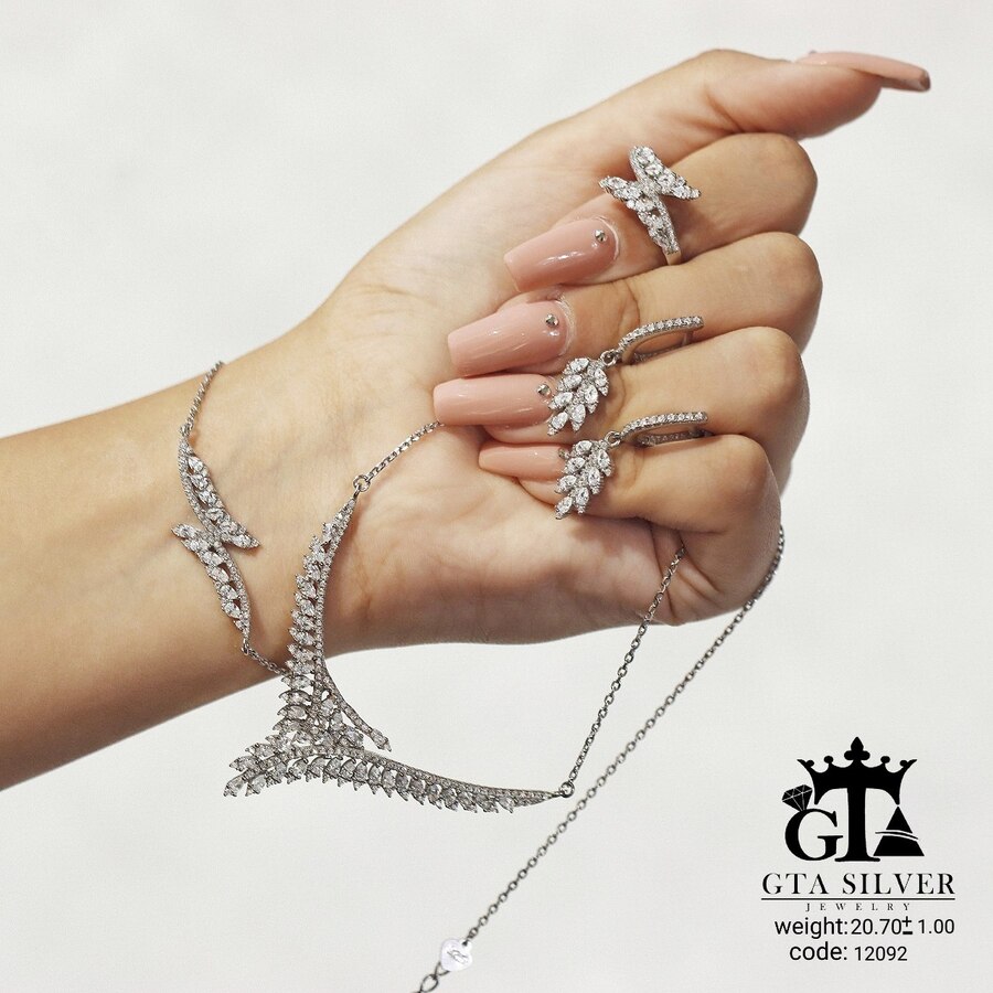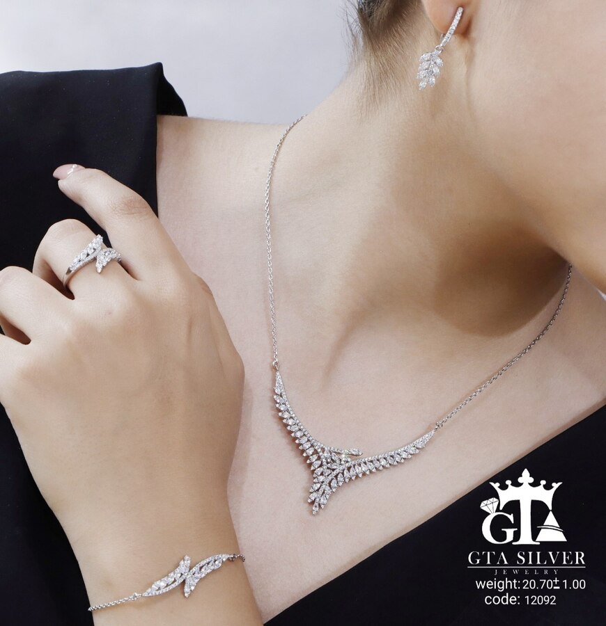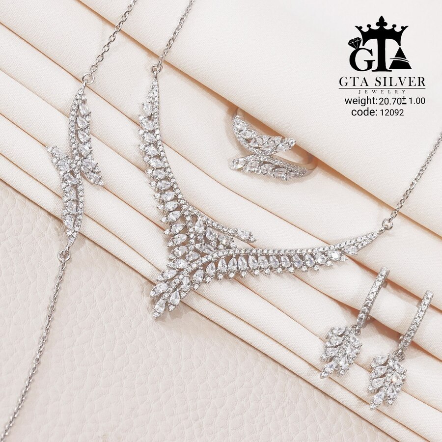 سرویس میکرو زنجیری نقره همراه با روکش آبطلای سفید؛ عیار 925، تمامی نگین های این سرویس جدید و ظریف با روش جدید میکروستینگ مخراج کاری شده است.
