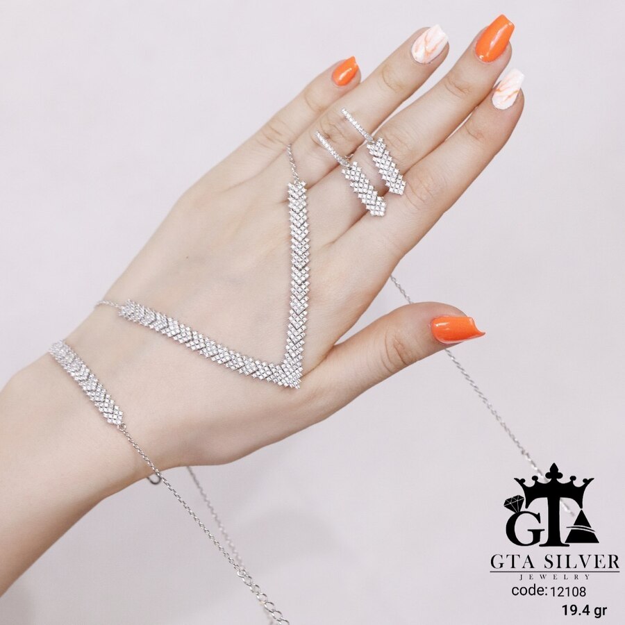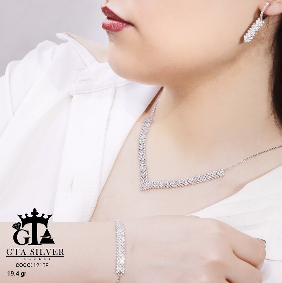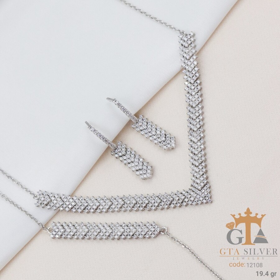 سرویس میکرو زنجیری نقره همراه با روکش آبطلای سفید؛ عیار 925، تمامی نگین های این سرویس جدید و ظریف با روش جدید میکروستینگ مخراج کاری شده است.