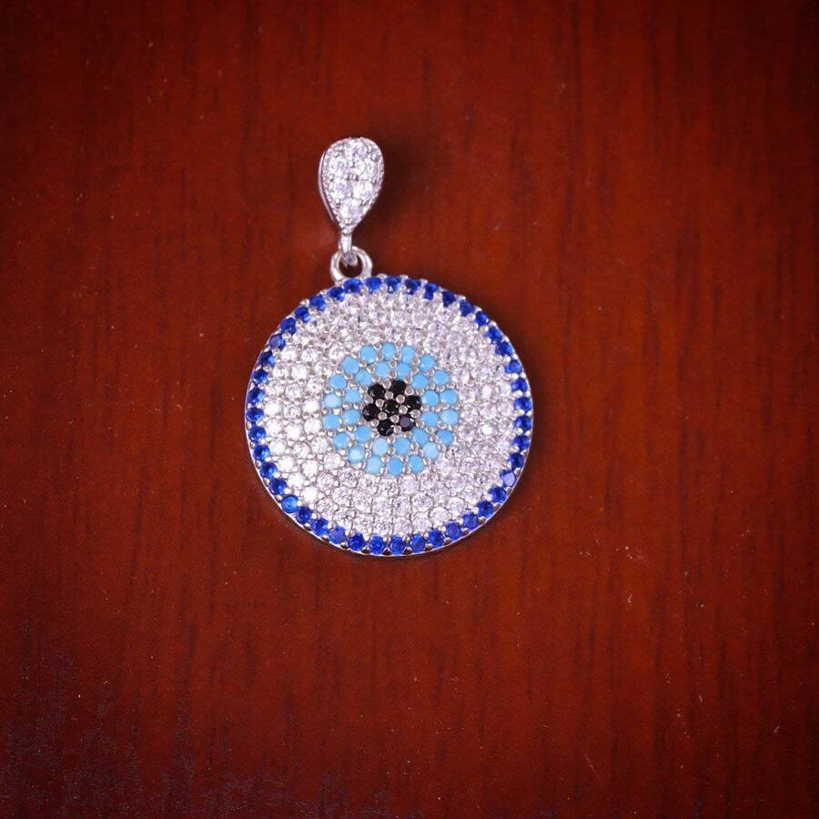 مدال میکرورنگی طرح چشم نظر , کاری بسیار ظریف و زیبا که نگین هایش با روش میکروستینگ مخراج کاری شده و دارای روکش آبطلای سفید می باشد. عیار این کار مانند تمامی کار های موجود, عیار استاندارد 925 می باشد.