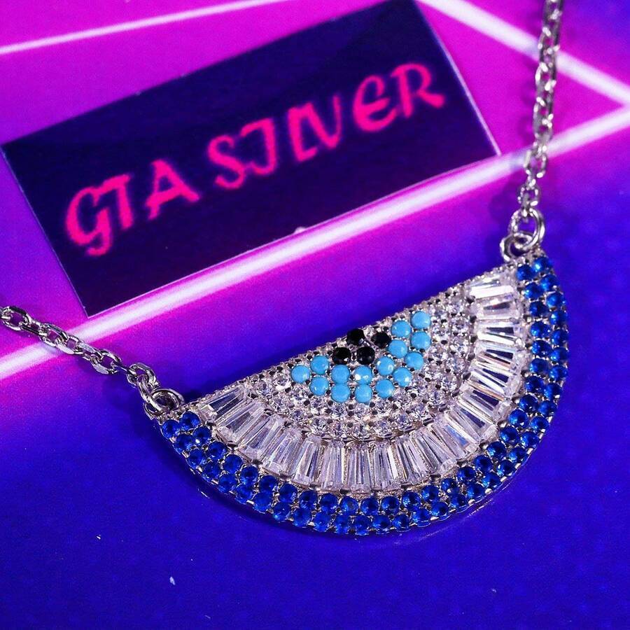 مدال میکرورنگی طرح چشم نظر همراه با زنجیر , کاری بسیار ظریف و زیبا که نگین هایش با روش میکروستینگ مخراج کاری شده و دارای روکش آبطلای سفید می باشد. عیار این کار مانند تمامی کار های موجود, عیار استاندارد 925 می باشد.