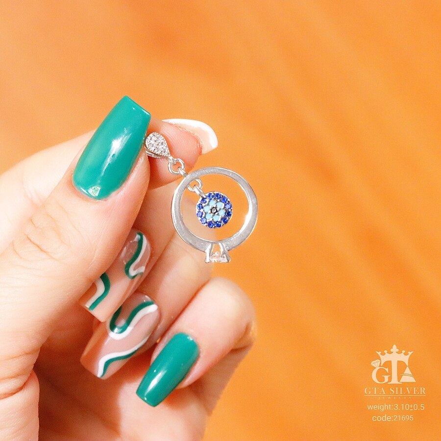 مدال نقره میکرو طرح حلقه و چشم نظر , کاری بسیار ظریف و زیبا که نگین هایش با روش میکروستینگ مخراج کاری شده و دارای روکش آبطلای سفید می باشد. عیار این کار مانند تمامی کار های موجود, عیار استاندارد 925 می باشد.