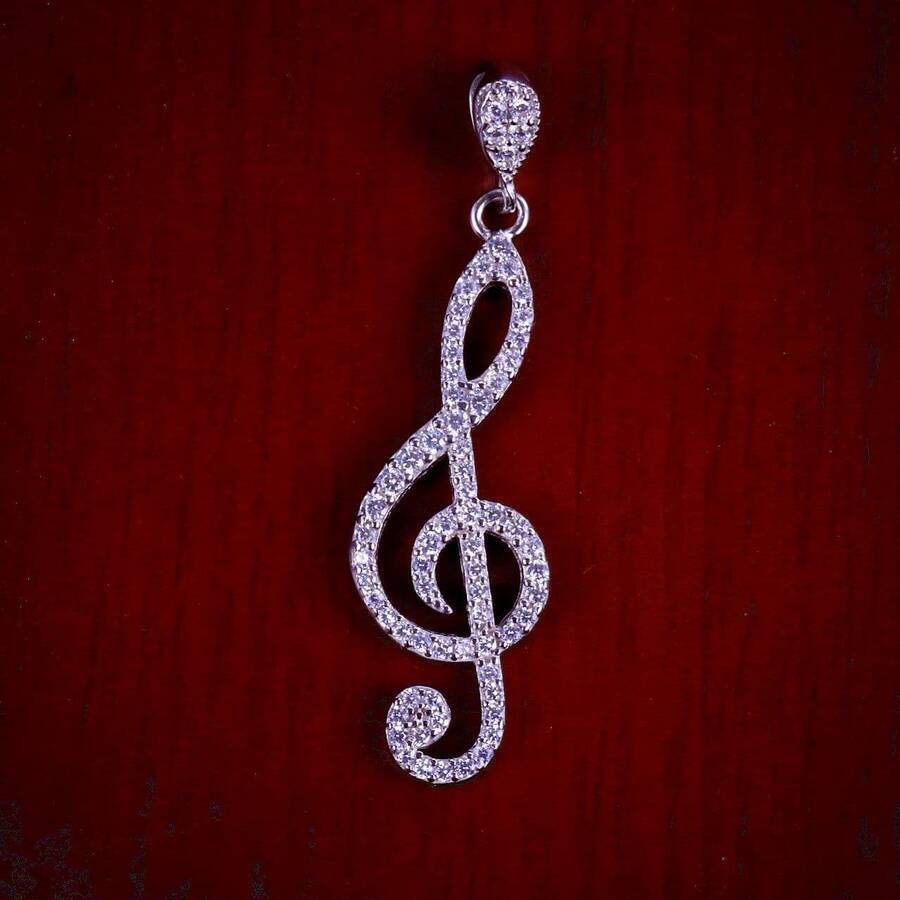 مدال میکرو طرح نت موسیقی , کاری بسیار ظریف و زیبا که نگین هایش با روش میکروستینگ مخراج کاری شده و دارای روکش آبطلای سفید می باشد. عیار این کار مانند تمامی کار های موجود, عیار استاندارد 925 می باشد.