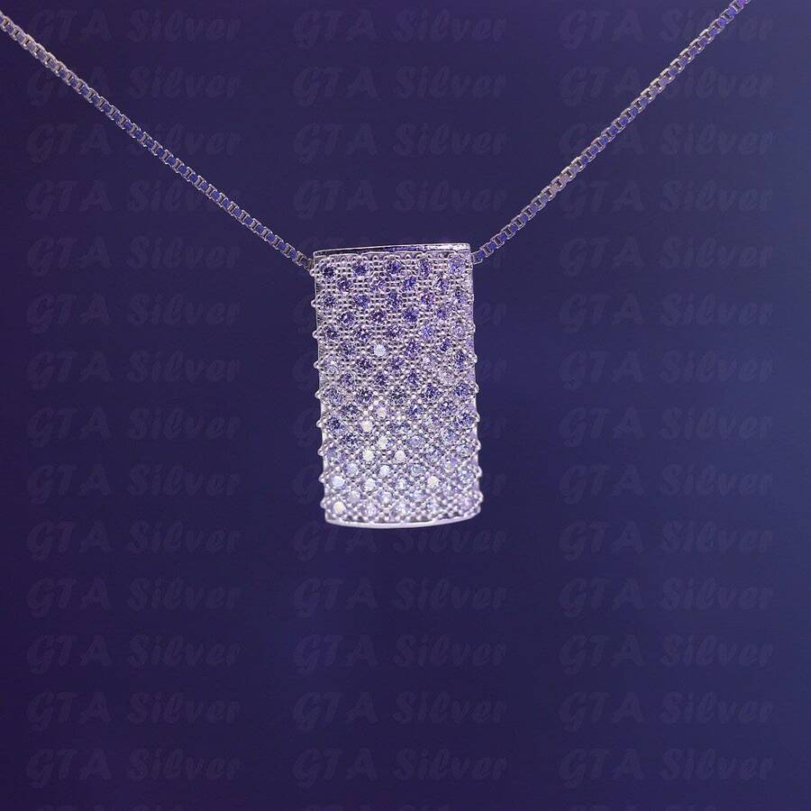 مدال میکرو همراه با روکش آب طلای سفید که نگین هایش به روش میکروستینگ مخراج کاری شده اند. عیار این کار مانند تمامی کار های موجود, عیار استاندارد 925 می باشد. (وزن درج شده بدون زنجیر محاسبه شده است )