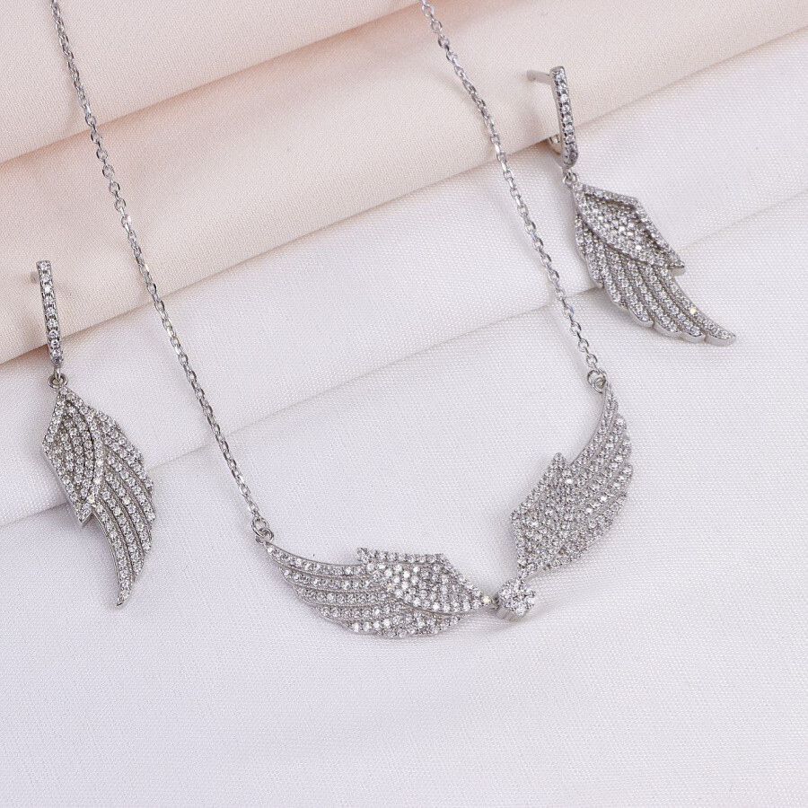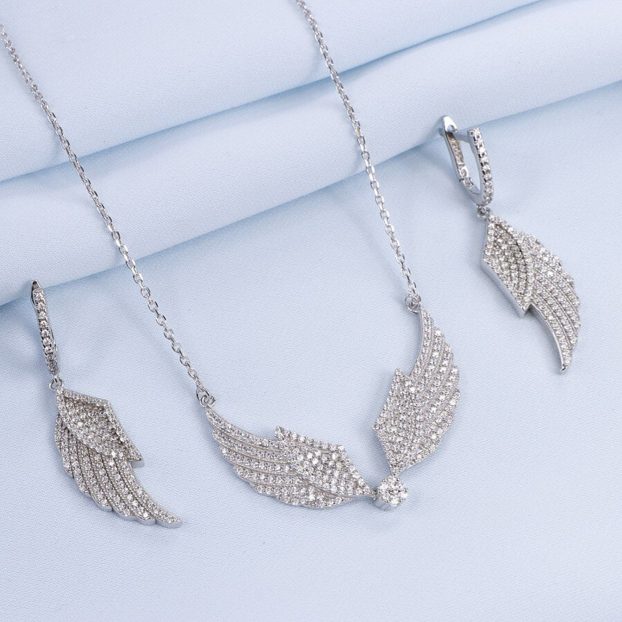 نیم ست میکرو طرح بال همراه با زنجیر و روکش آبطلای سفید؛ لازم به ذکر است که تمامی نگین های این نیم ست جدید و ظریف با روش جدید و به روز میکروستیگ مخراج کاری شده اند.