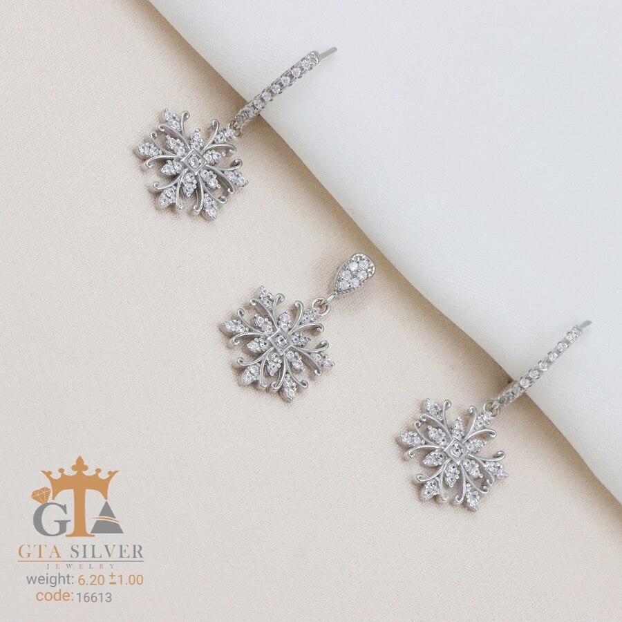 نیم ست نقره مدل میکرو همراه با روکش آبطلای سفید؛ عیار 925، تمامی نگین های این نیم ست جدید، ظریف با روش جدید میکروستینگ مخراج کاری شده