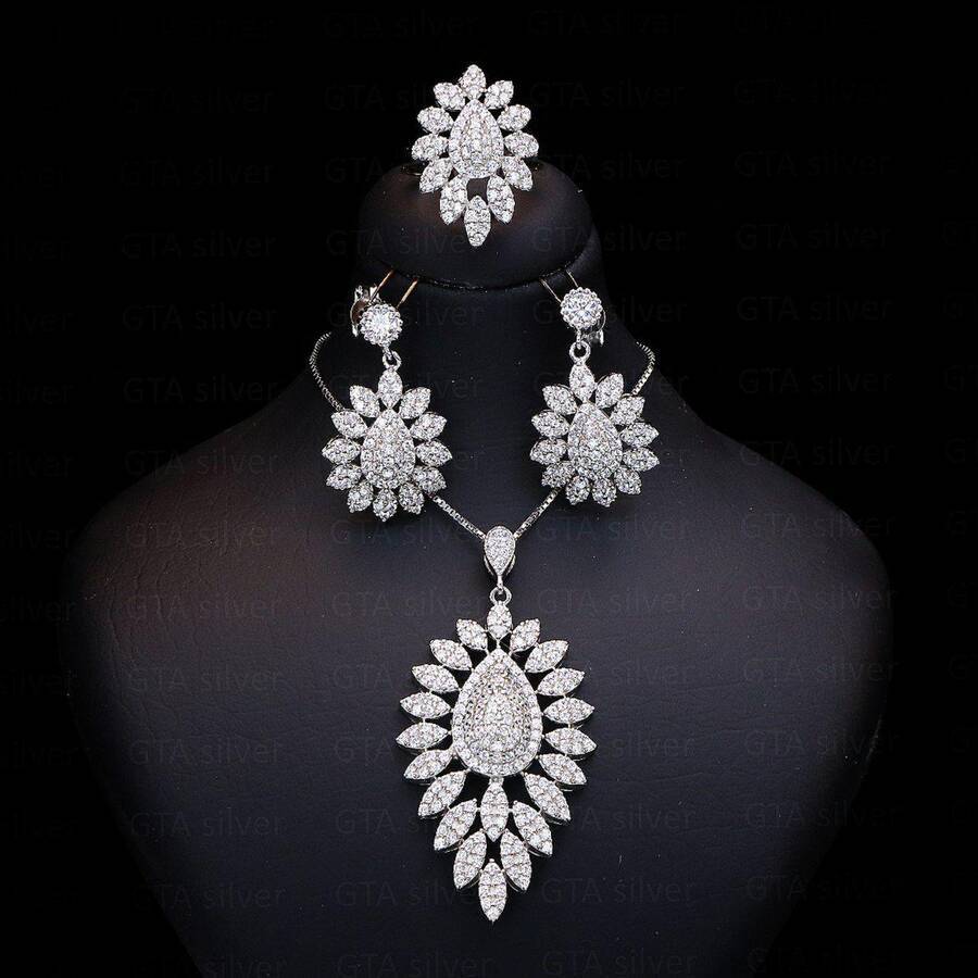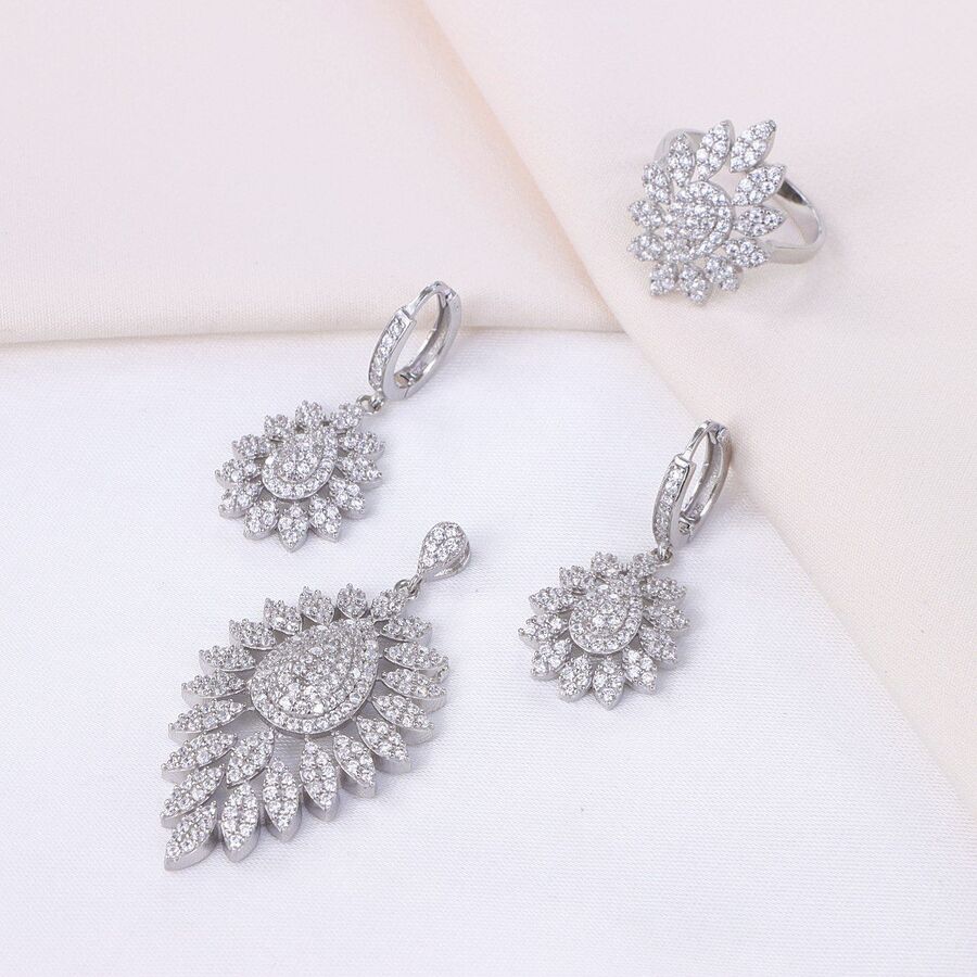 نیم ست مدل میکرو همراه با روکش آبطلای سفید؛ لازم به ذکر می باشد که عیار این کار مانند تمامی کارهای موجود, عیار استاندارد 925 بوده و تمامی نگین های این نیم ست با روش جدید و به روز میکروستیگ مخراج کاری شده اند.