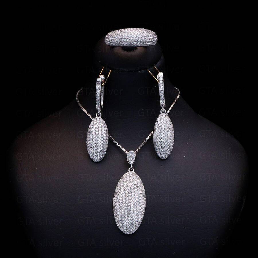 نیم ست مدل میکرو همراه با روکش آبطلای سفید؛ لازم به ذکر می باشد که عیار این کار مانند تمامی کارهای موجود, عیار استاندارد 925 بوده و تمامی نگین های این نیم ست با روش جدید و به روز میکروستیگ مخراج کاری شده اند.