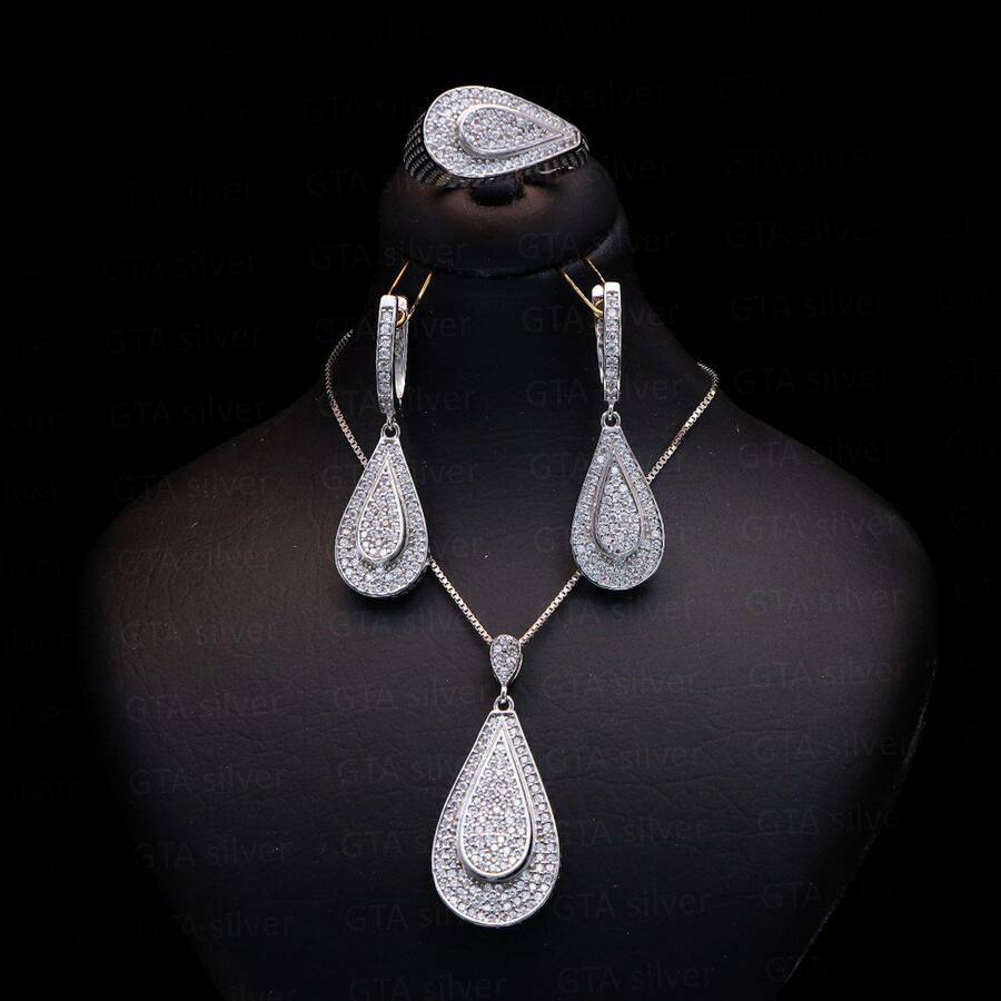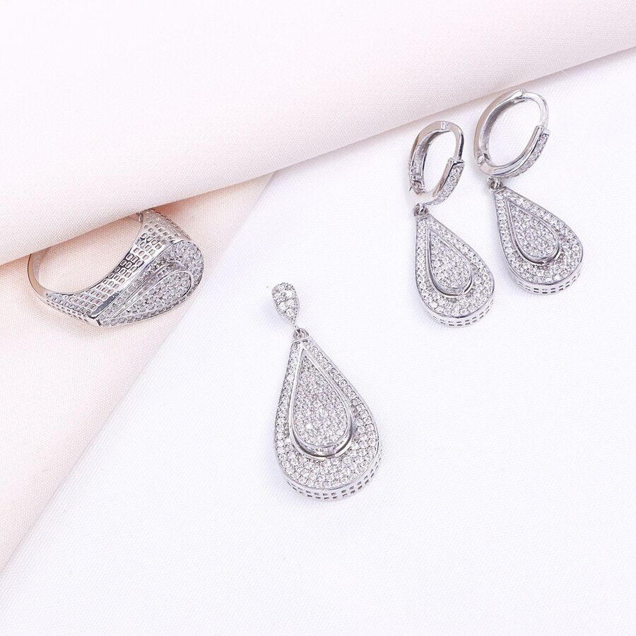 نیم ست مدل میکرو همراه با روکش آبطلای سفید؛ لازم به ذکر می باشد که عیار این کار مانند تمامی کارهای موجود, عیار استاندارد 925 بوده و تمامی نگین های این نیم ست با روش جدید و به روز میکروستیگ مخراج کاری شده اند.