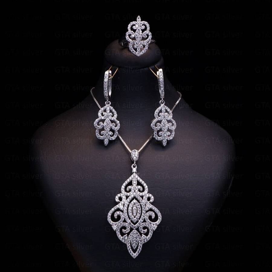 نیم ست مدل میکرو همراه با روکش آبطلای سفید؛ لازم به ذکر می باشد که عیار این کار مانند تمامی کارهای موجود, عیار استاندارد 925 بوده و تمامی نگین های این نیم ست با روش جدید و به روز میکروستیگ مخراج کاری شده اند.