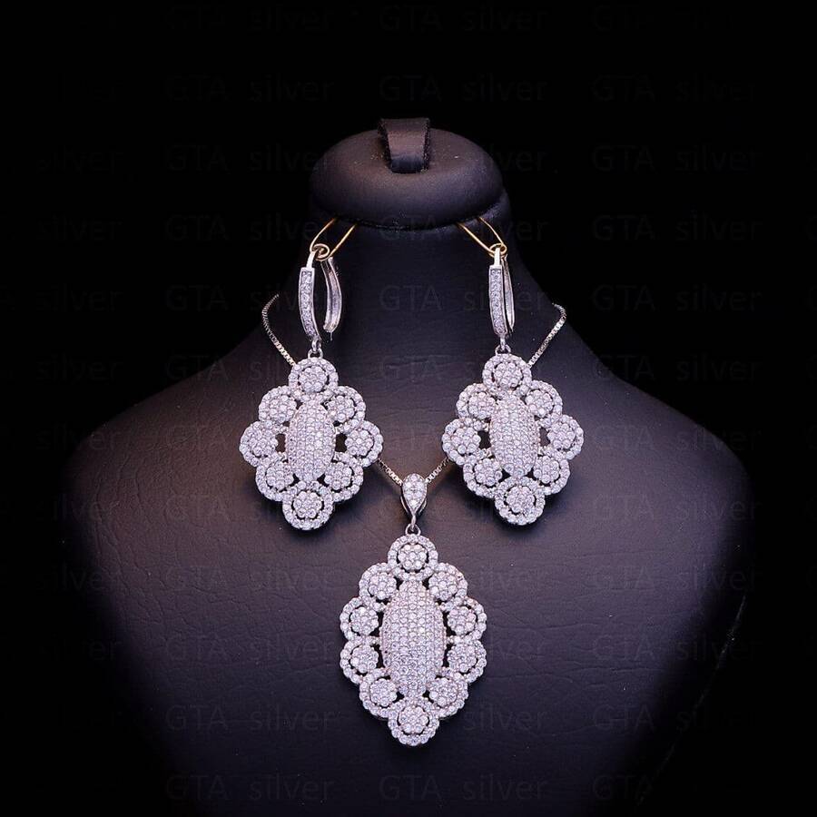 نیم ست مدل میکرو همراه با روکش آبطلای سفید؛ لازم به ذکر می باشد که عیار این کار مانند تمامی کارهای موجود, عیار استاندارد 925 بوده و تمامی نگین های این نیم ست با روش جدید و به روز میکروستیگ مخراج کاری شده اند.