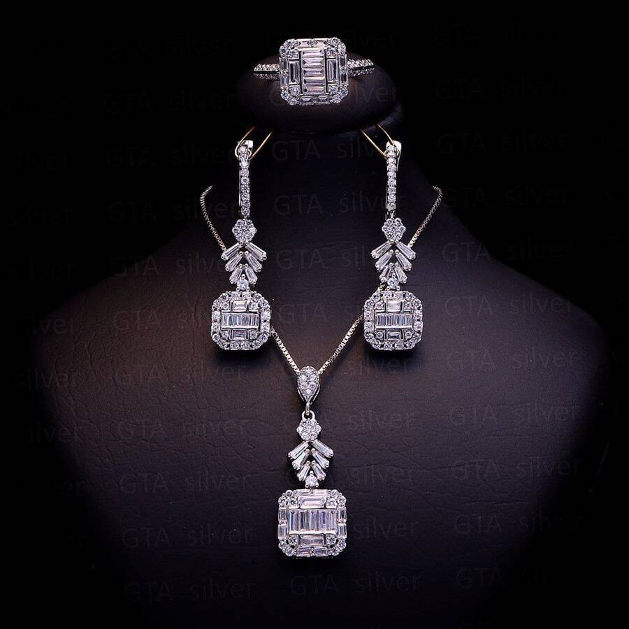 نیم ست مدل میکرو همراه با روکش آبطلای سفید؛ لازم به ذکر می باشد که عیار این کار مانند تمامی کارهای موجود, عیار استاندارد 925 بوده و تمامی نگین های این نیم ست با روش جدید و به روز میکروستیگ مخراج کاری شده اند.