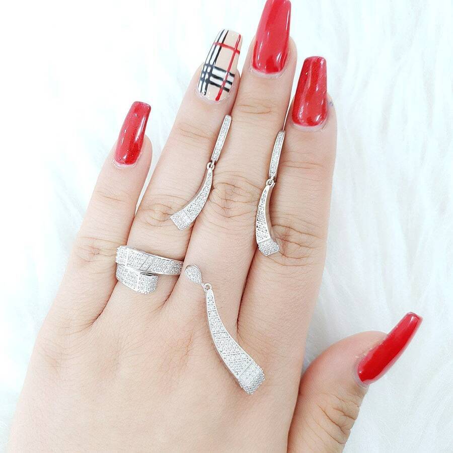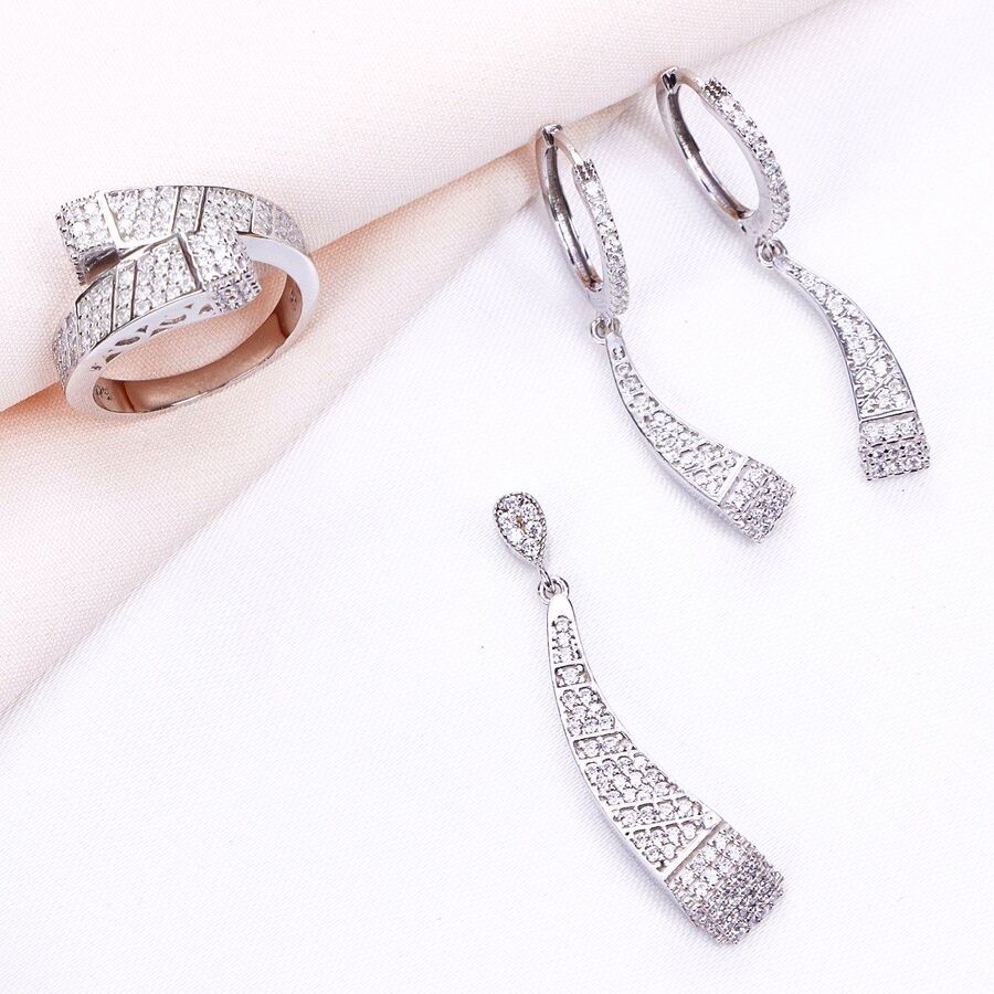 نیم ست مدل میکرو همراه با روکش آبطلای سفید؛ لازم به ذکر می باشد که عیار این کار مانند تمامی کارهای موجود, عیار استاندارد 925 بوده و تمامی نگین های این نیم ست با روش جدید و به روز میکروستیگ مخراج کاری شده اند.