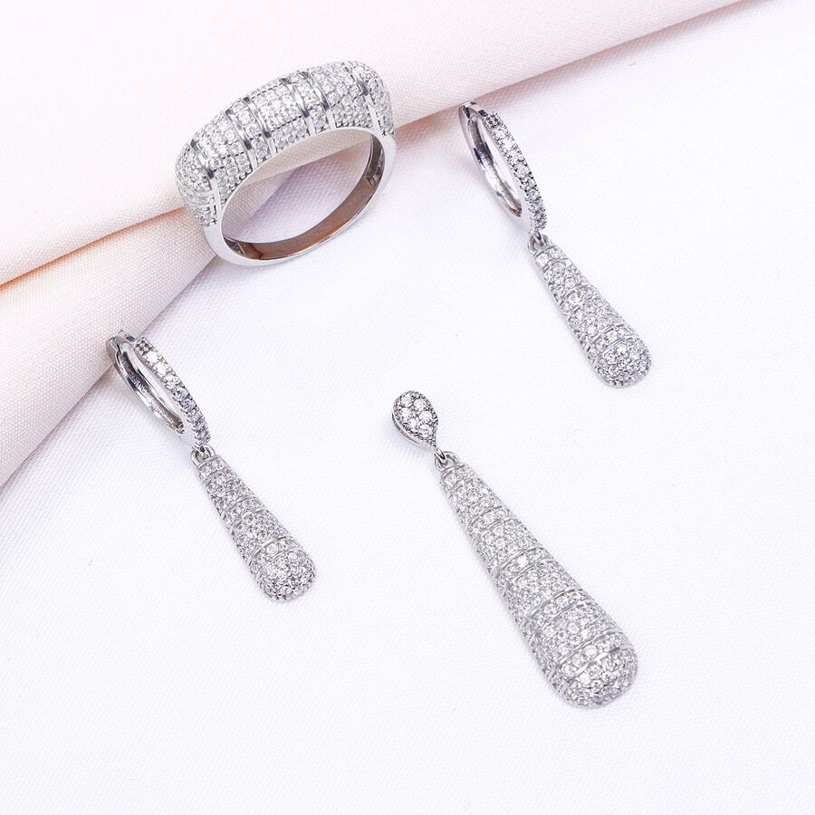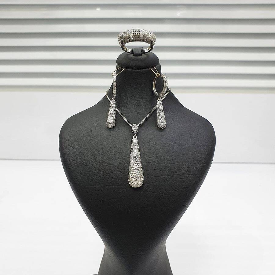 نیم ست مدل میکرو همراه با روکش آبطلای سفید؛ لازم به ذکر است که تمامی نگین های این نیم ست جدید و ظریف با روش جدید و به روز میکروستیگ مخراج کاری شده اند. (وزن نیم ست بدون زنجیر محاسبه شده است و مدال بدون زنجیر می باشد)