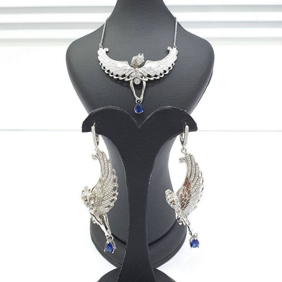 نیم ست مدل میکرو طرح جدید بال همراه با زنجیر و روکش آبطلای سفید؛ لازم به ذکر است که تمامی نگین های این نیم ست جدید و ظریف با روش جدید و به روز میکروستیگ مخراج کاری شده اند.
