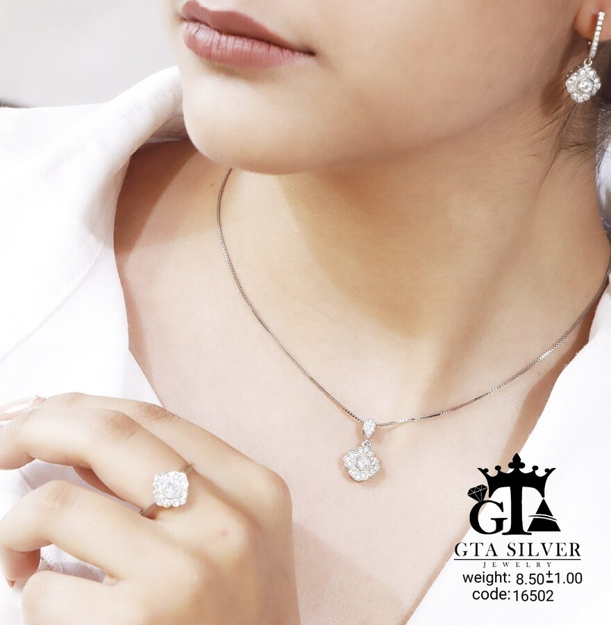 نیم ست نقره مدل میکرو همراه با روکش آبطلای سفید؛ عیار 925، تمامی نگین های این نیم ست جدید، ظریف با روش جدید میکروستینگ مخراج کاری شده