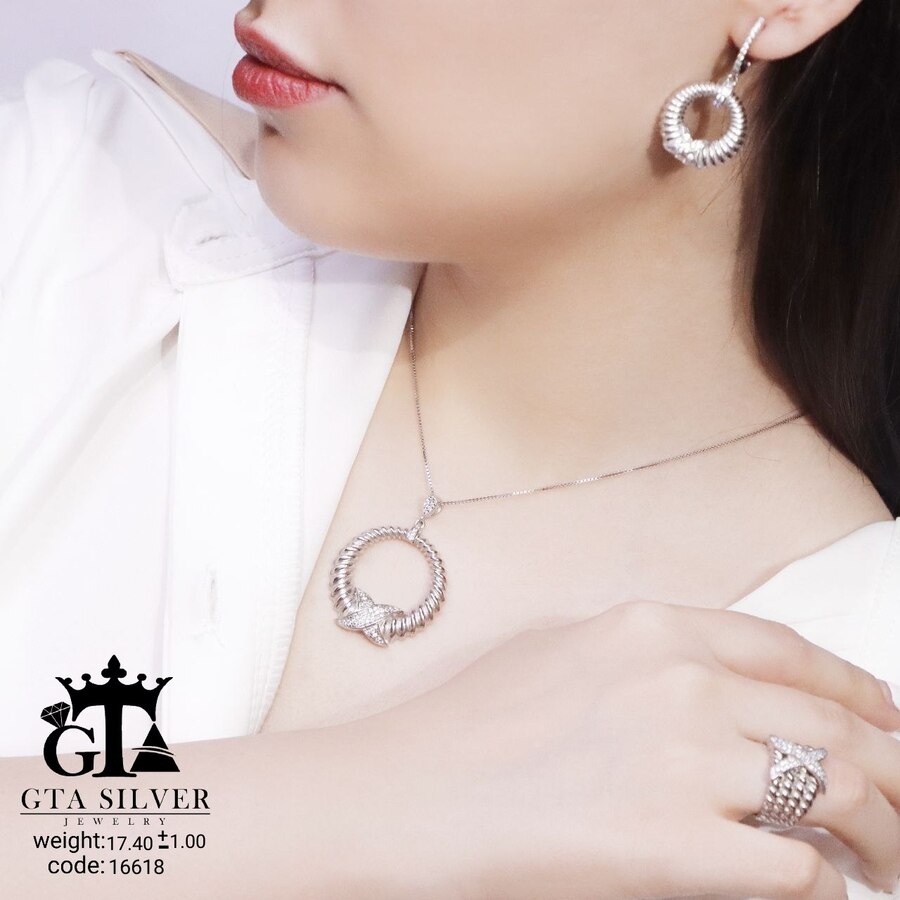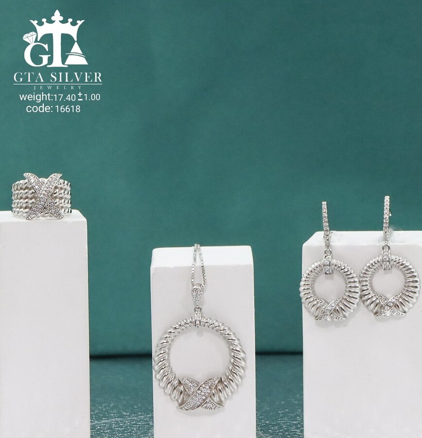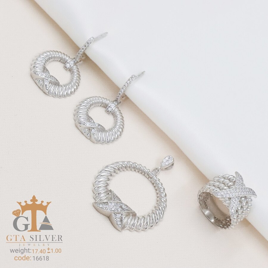 نیم ست نقره مدل میکرو همراه با روکش آبطلای سفید؛ عیار 925، تمامی نگین های این نیم ست جدید، ظریف با روش جدید میکروستینگ مخراج کاری شده