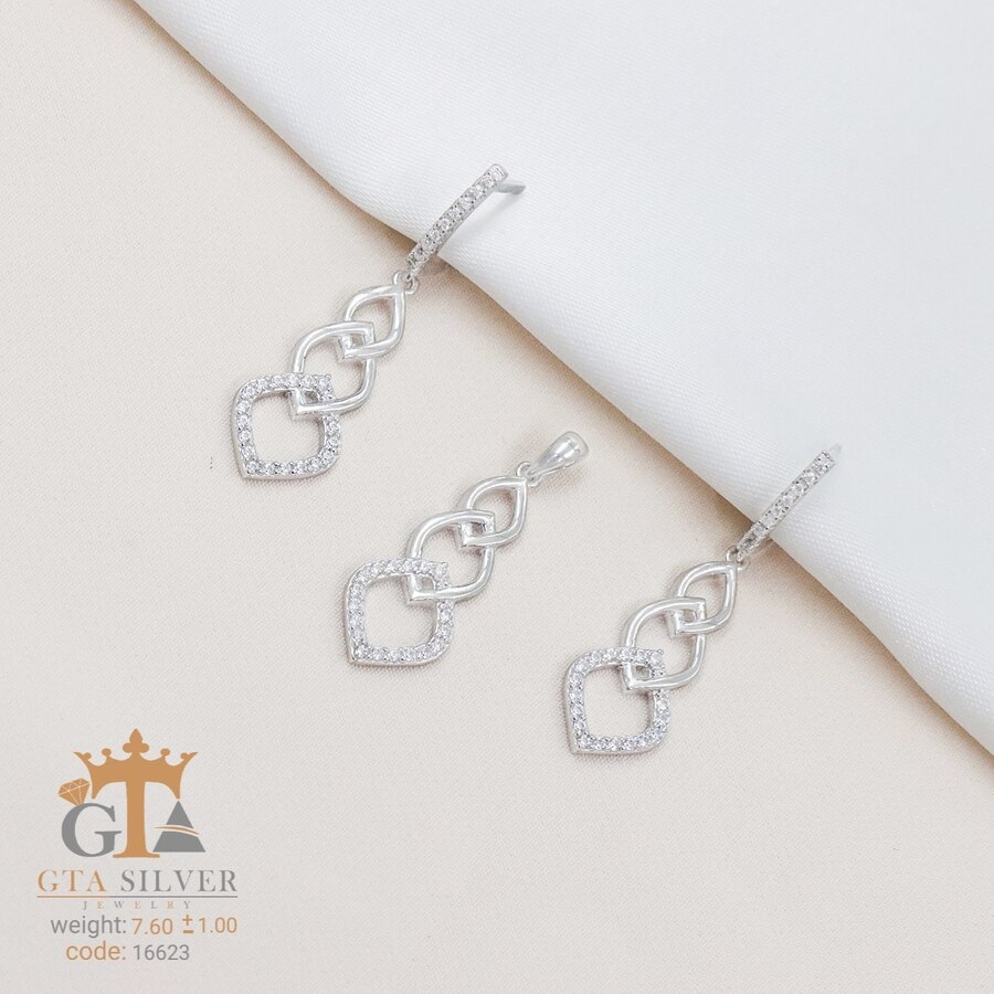 نیم ست نقره مدل میکرو همراه با روکش آبطلای سفید؛ عیار 925، تمامی نگین های این نیم ست جدید، ظریف با روش جدید میکروستینگ مخراج کاری شده
